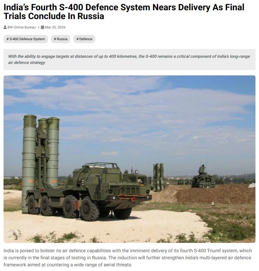 尽管俄乌冲突中,俄军的S-400防空导弹表现并不理想,多次被乌克兰的无人机、美制陆军战术导弹(ATACMS)摧毁,但对于印度来说,这已经是最好的选择了。印度国防部3月29日宣布,印度正在加快从俄罗斯引进第四套S-400系统的步伐,最快将于4月接收,并在11月完成第5套S-400的引进,从而确保印度版的国家导弹防御系统——“苏达山轮计划”能够按时完成。