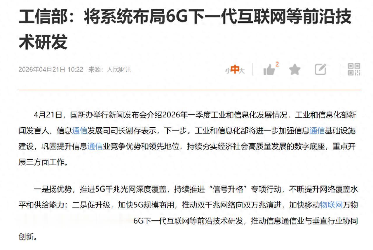 一、事件核心深度拆解1. 官方最新表态(2026.4.21)国新办一季度工信发布会,工信部信息通信发展司司长谢存明确三大核心工作: