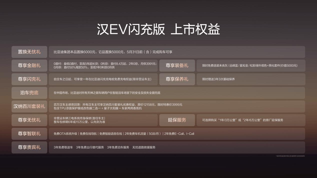 同时,比亚迪还为用户准备了置换无忧礼、1年免费闪充权益、0首付/0利息/0月供任选其一的金融礼、3年3次基础保养、包含3年免费取送车的尊享贵宾礼等共11项权益。针对追求个性的用户,官方推出价值超1.2万元的“汉纳百川”进阶生活套装,限时特惠价仅需3999元。