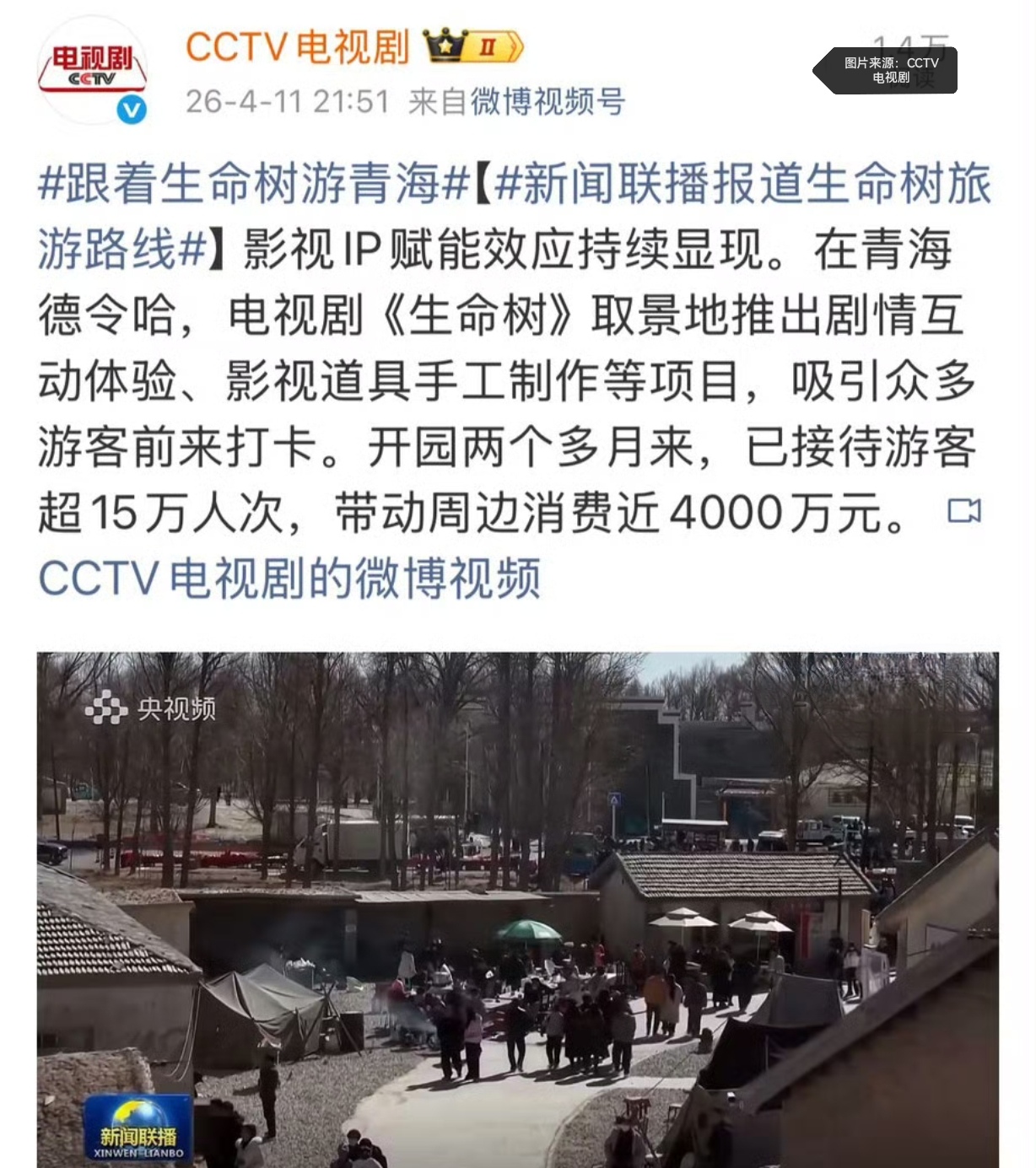 今晚的新闻联播,让演员杨紫和电视剧《生命树》狠狠刷了一波存在感!新闻里提到,这部剧在青海德令哈的取景地,如今成了热门旅游打卡地。当地借着影视IP的热度,推出了剧情互动体验、影视道具手工制作等特色项目,开园才两个月,就吸引了超过15万人次的游客,直接带动周边消费高达4000万元。影视IP和文旅产业的碰撞,不仅让观众记住了好作品,更让青海德令哈这个地方走进了大众视野,实现了口碑和经济的双丰收。