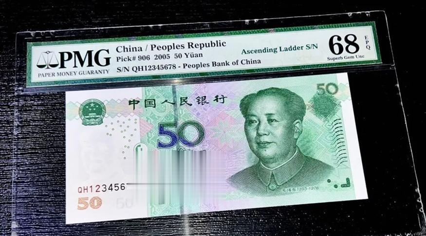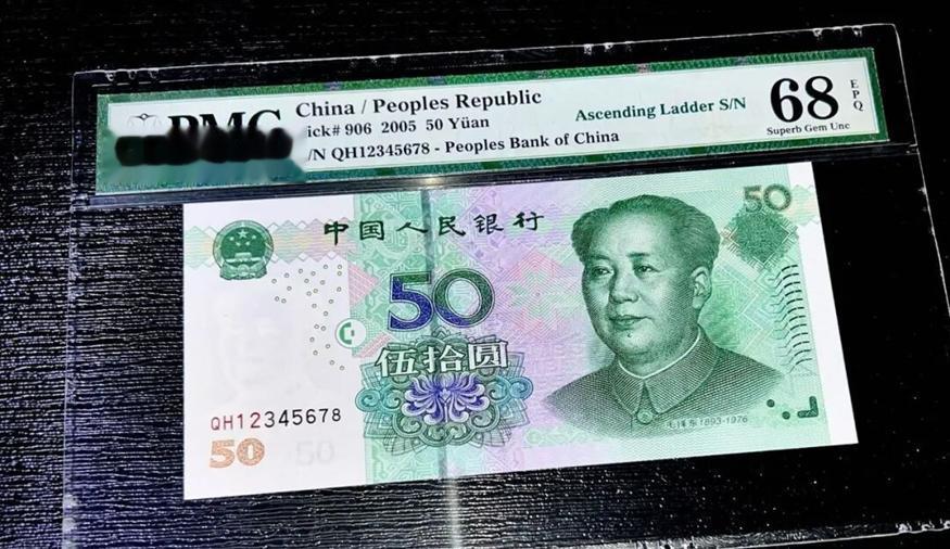 真正称得上天花板级别的,是05版50元里的天顺号。冠号QH12345678这张纸币,流水号码从左至右依次递增排列,数字连贯顺畅,是天顺号里的标准品相。这张纸币经过PMG专业评级,获得68分高分,品相达到顶级未流通状态,纸张品质完美。