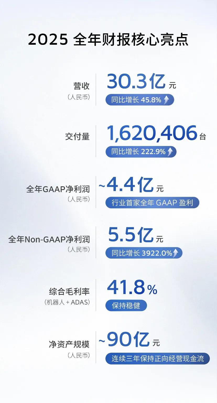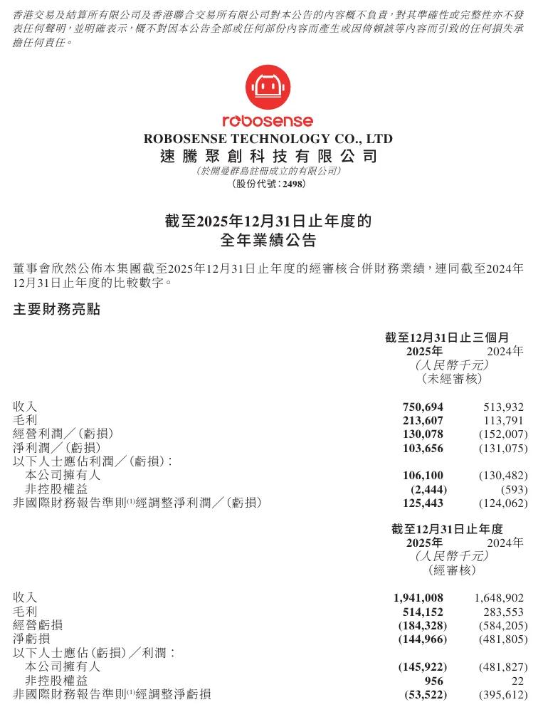 2025年全年,速腾聚创营收约19.41亿元,综合毛利率提升至26.5%,全年毛利约5.14亿元,同比增长81.3%。