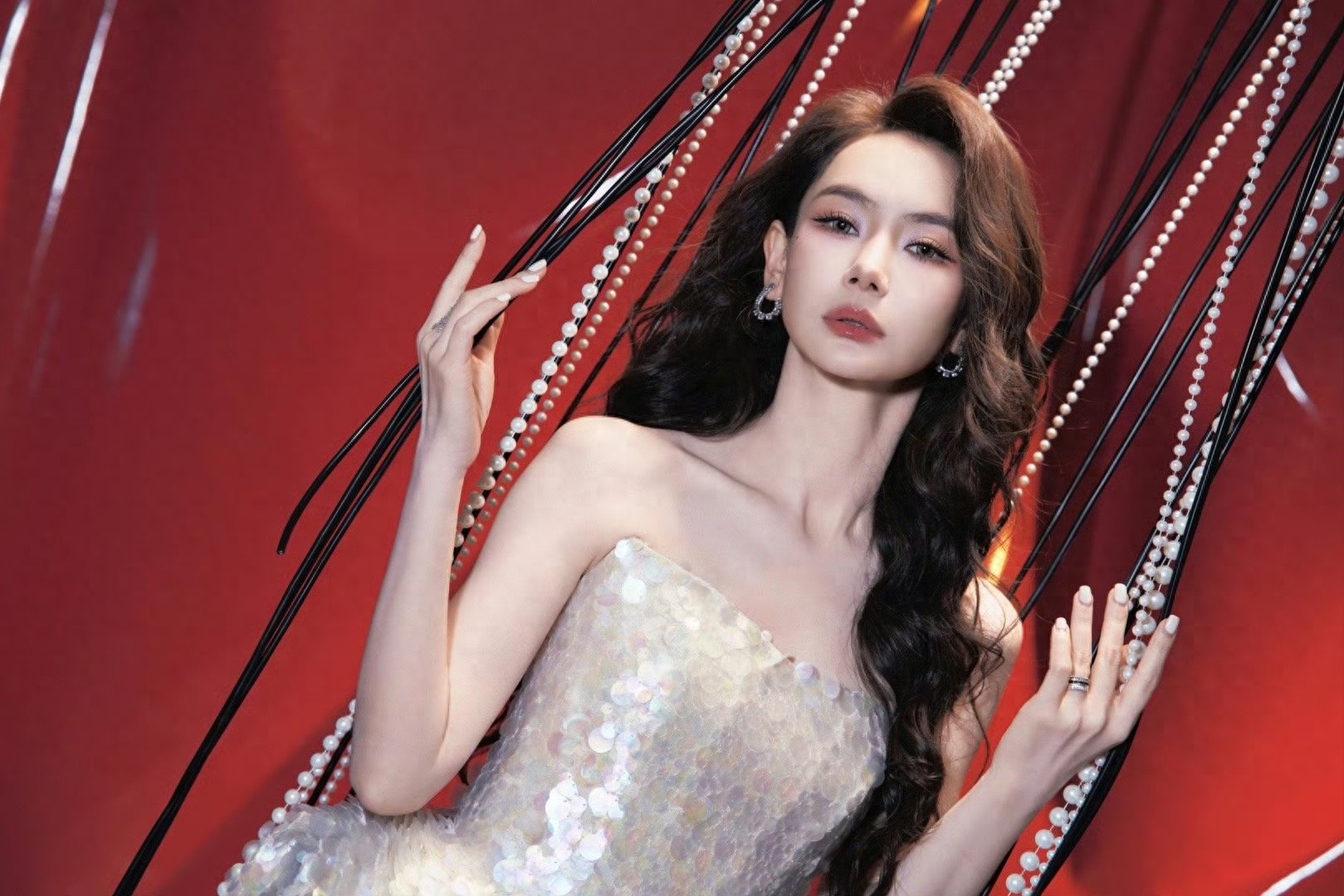 戚薇银色抹胸连衣裙,珠链萦身映绸缎,白裙曳地耀流光