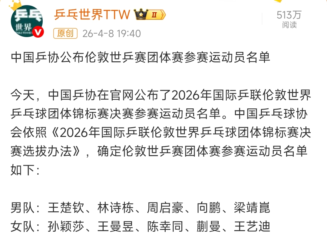 国乒教练组也在后续宣布伦敦团体世乒赛最后一个参赛名额由老将梁靖崑获得。最终伦敦团体世乒赛国乒男队将由王楚钦、林诗栋、周启豪、向鹏、梁靖崑五人出战。