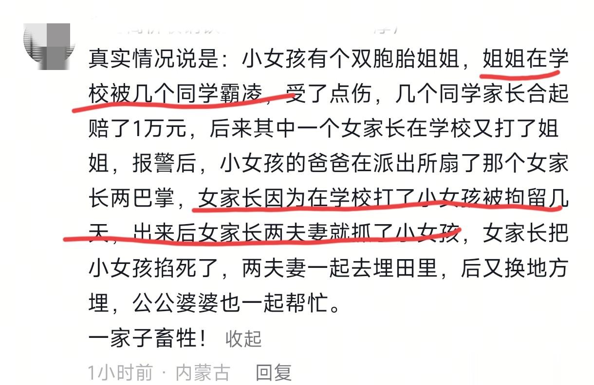 这时候,就有人说是佩佩的姐姐在学校被几个同学霸 凌,姐姐受了伤,那几个同学的父母赔了1万块钱给佩佩的姐姐。有个家长不服,又在学校里打了佩佩的姐姐,又闹到帽子叔叔那里,佩佩的爸爸打了那个家长两巴掌,女家长被拘留了几天,那个家长出来后恶意报复,杀 了佩佩。