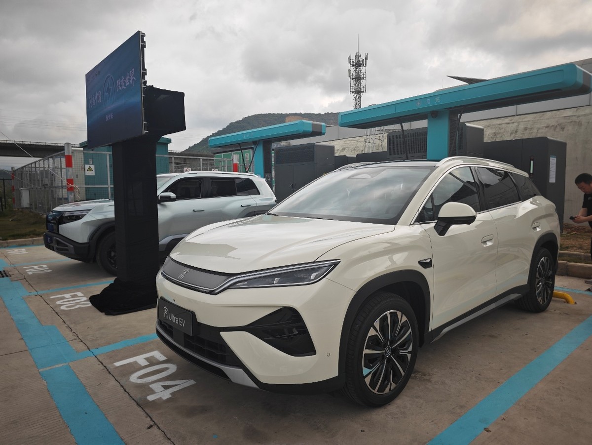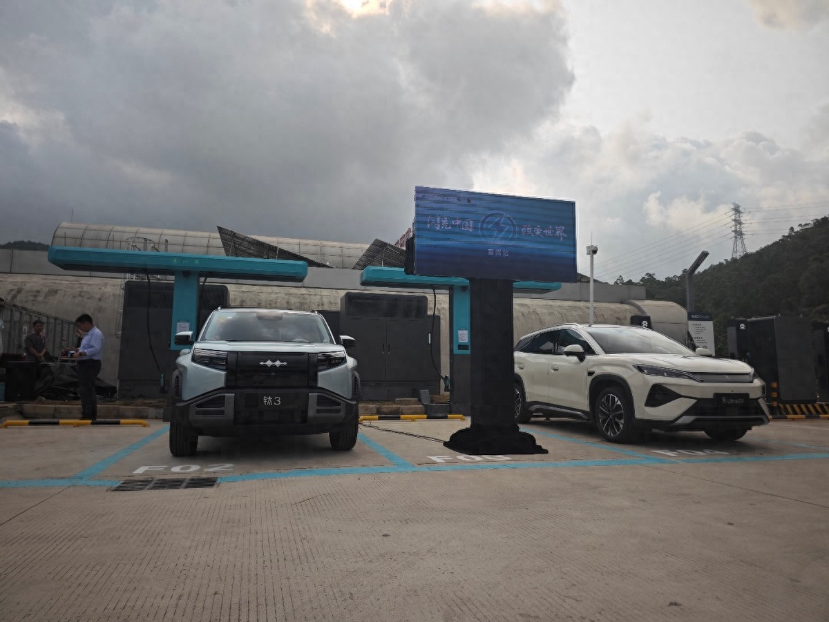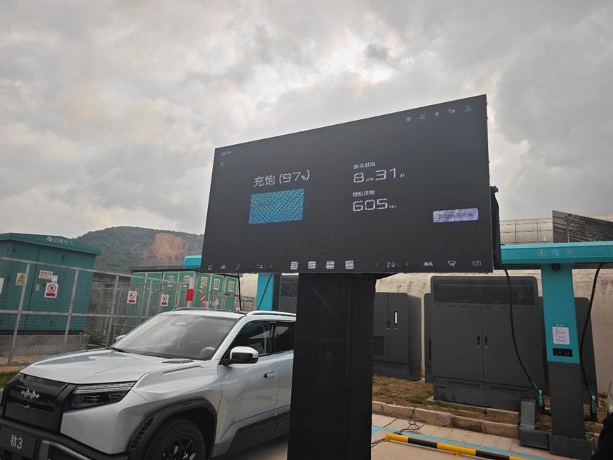 在广惠高速的龙康围服务区正好有两座已经建成的比亚迪闪充站,这次参与测试的方程豹钛3闪充版和比亚迪宋Ultra EV都是刚刚上市的闪充车型。两车电量都从10%开始充,到70%时分别用时4分55秒——比官方宣称的5分钟还快了5秒。到97%满电,钛3用了8分31秒,宋Ultra用了8分34秒,跟官方“9分钟充饱”的说法完全对得上。