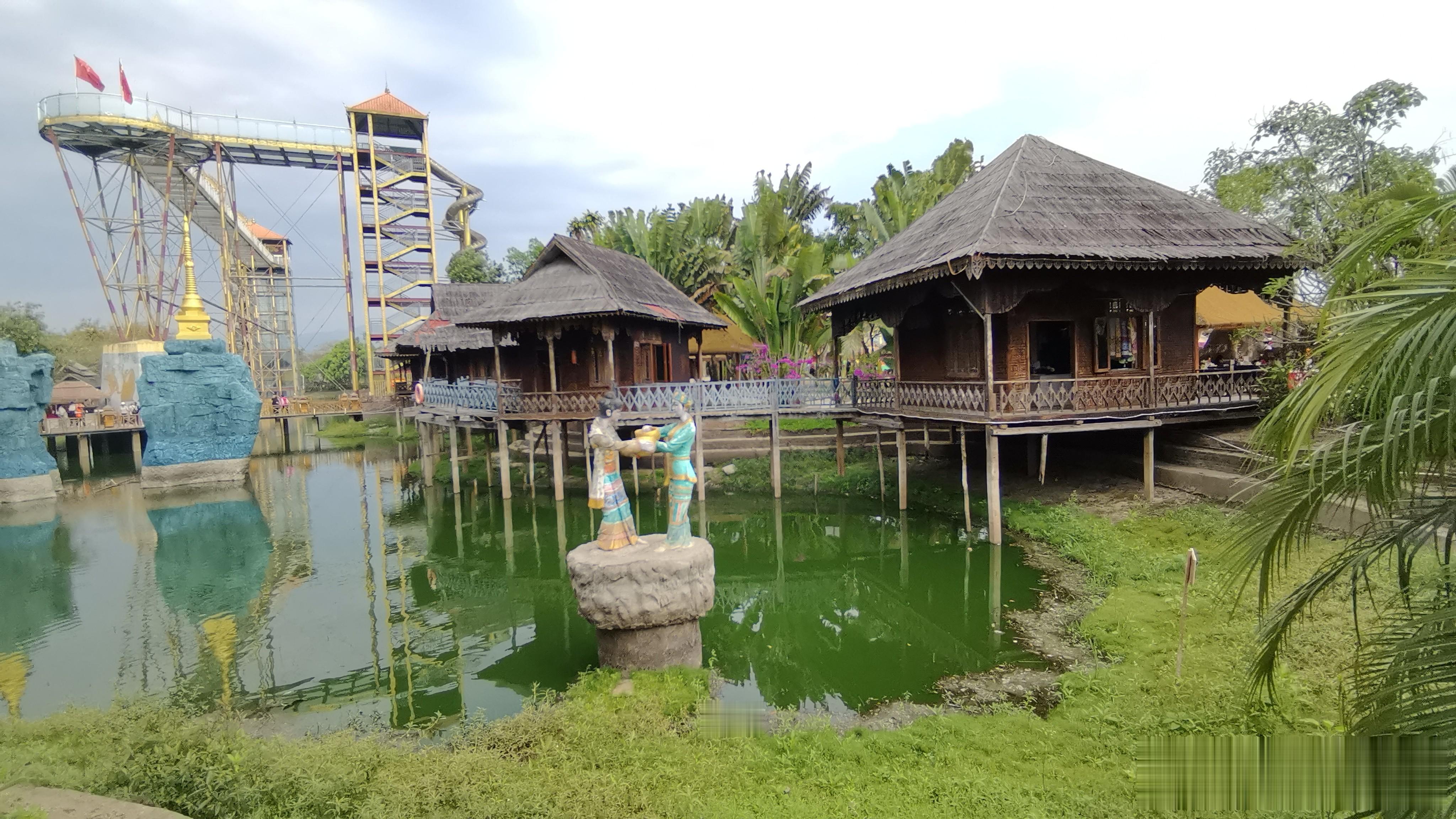 最养眼的要数那些穿着傣族服饰的姑娘们了。红的、绿的、粉的筒裙,配上银饰,在园区各个景点摆pose拍照。有的站在缅甸风格的佛塔前,有的坐在竹楼下,还有的在那个著名的"一秋荡两国"秋千上荡来荡去——据说那个秋千一荡起来,人就在两个国家之间来回晃悠,挺有意思。