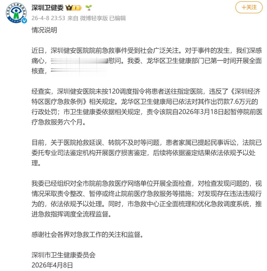 深圳龙华区卫健部门最终认定:健安医院连续两次违反急救调度管理规则,情节严重、性质恶劣,依法作出处罚:行政罚款7.6万元,同时暂停该院院前急救服务资质半年。