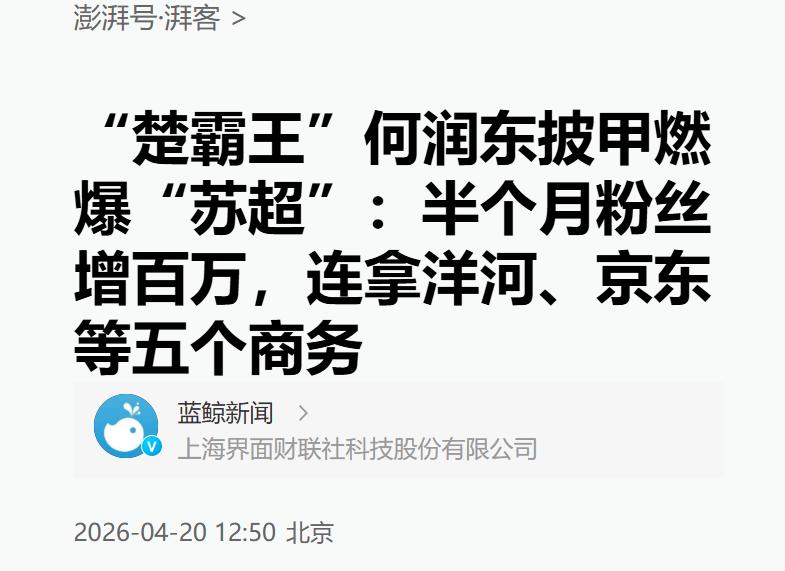 澎湃新闻:“楚霸王”何润东披甲燃爆“苏超”:半个月粉丝增百万,连拿洋河、京东等五个商务
