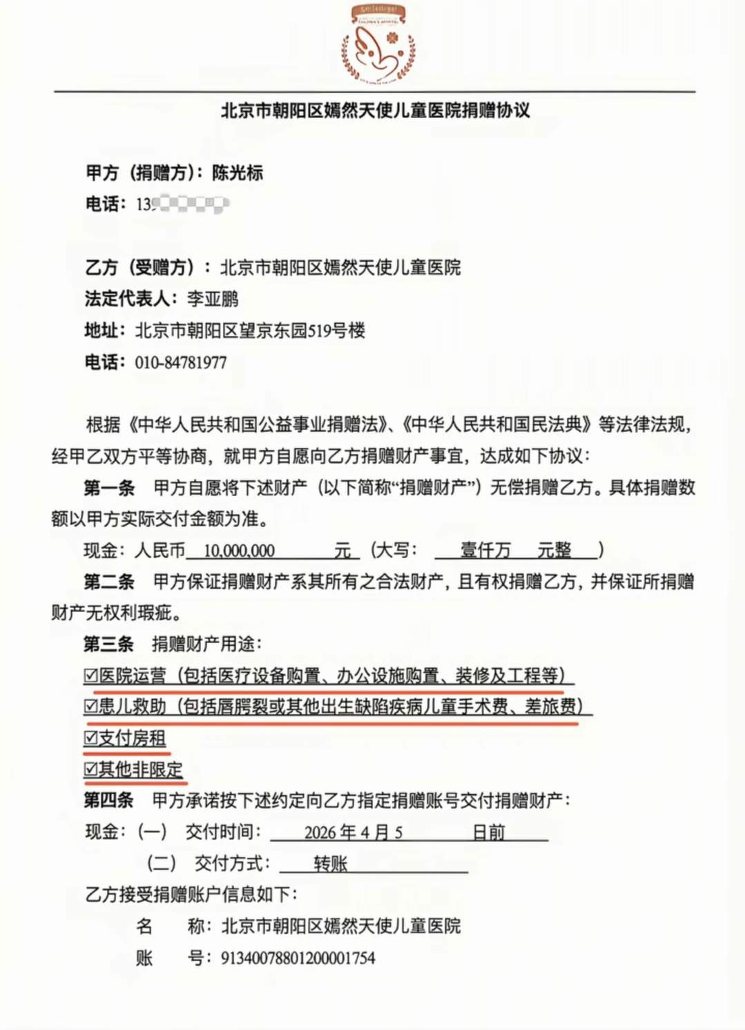 陈光标晒捐赠协议书证清白,捐赠用途可以付房租对于网上的非议,陈光标先生做出了回应,在自己的平台账号上曝出了和嫣然天使儿童医院的捐赠协议,里面清楚的写着捐赠用途有四种: