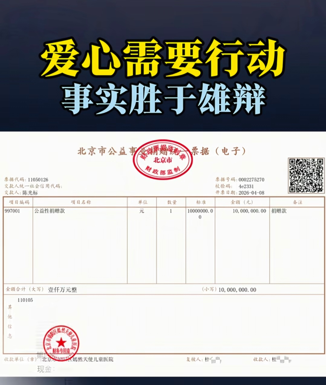 网友质疑陈光标是假捐款,以慈善之名骗取流量本来陈光标发出了捐款的汇款回执单,就已经证明捐出了这笔钱了,没想到很多网友看了汇款单反而觉得陈光标是“假捐款、假慈善”。