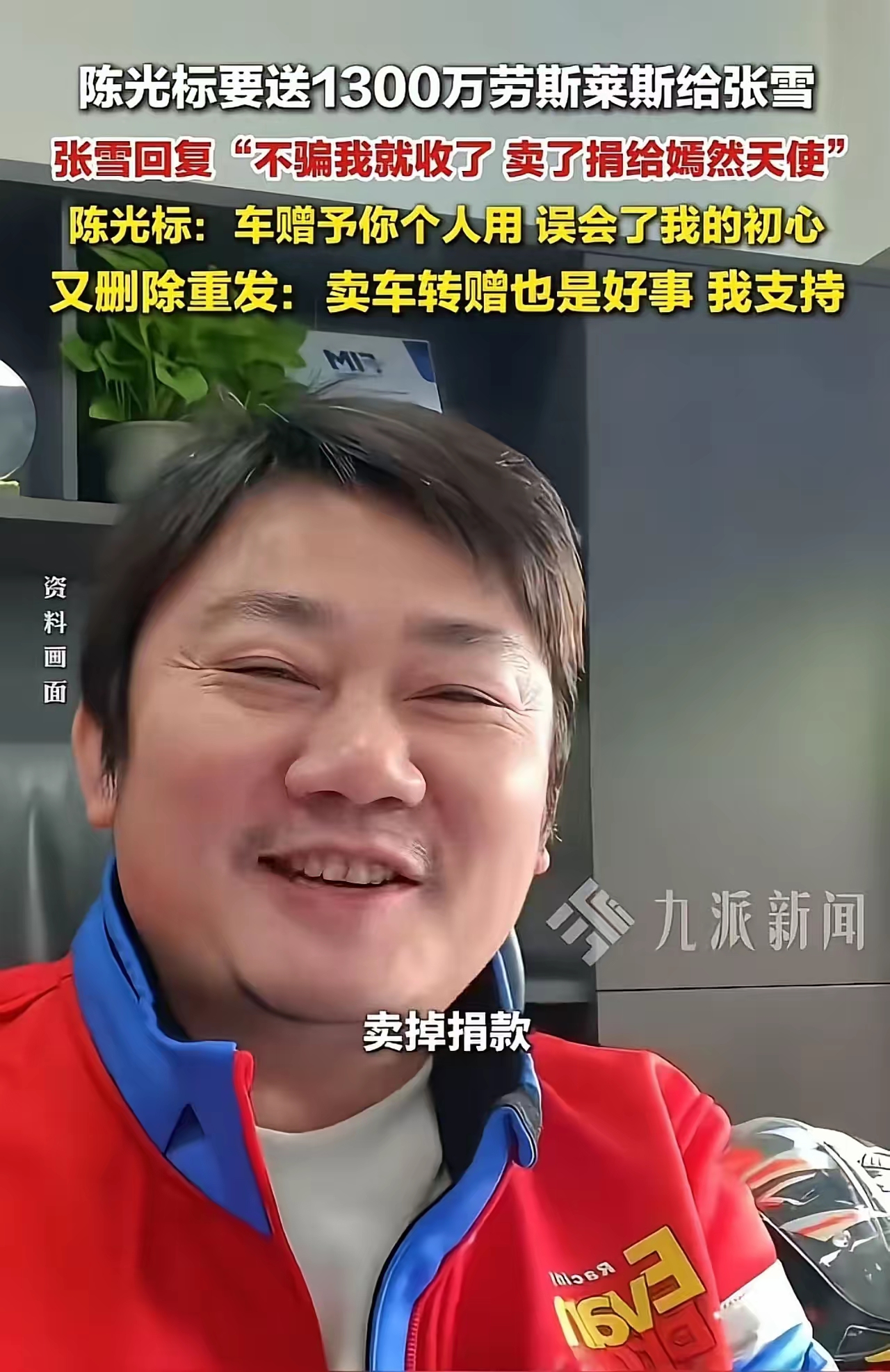 看到张雪的回应,陈光标先生也是赶紧发了一条信息,说是这辆车是新车,还没有上车牌,为了表达对张雪的敬意想赠给他个人使用。如果他想卖二手车去转赠,误会了他的初衷,然后就说直接捐款1000万元给嫣然天使。
