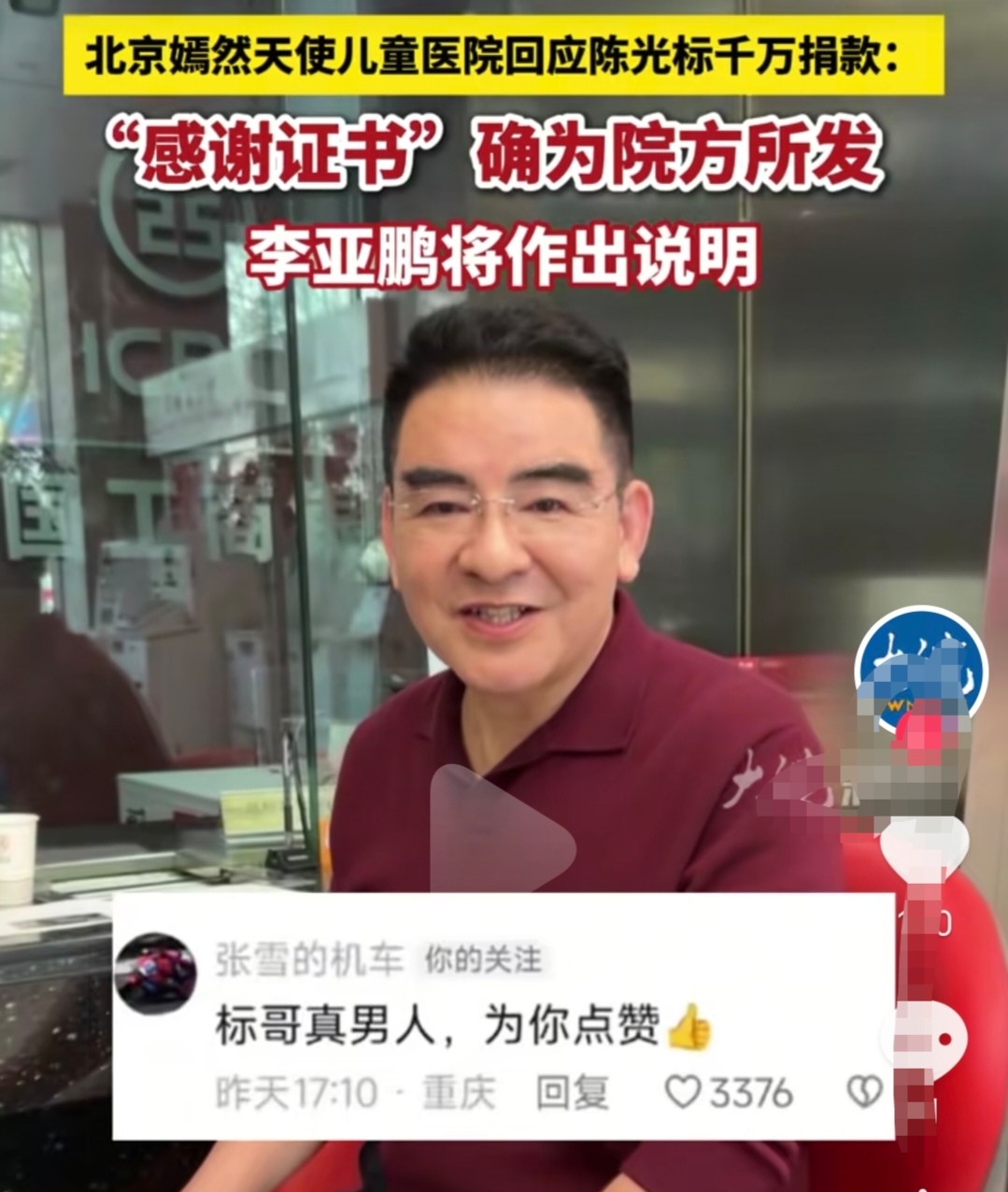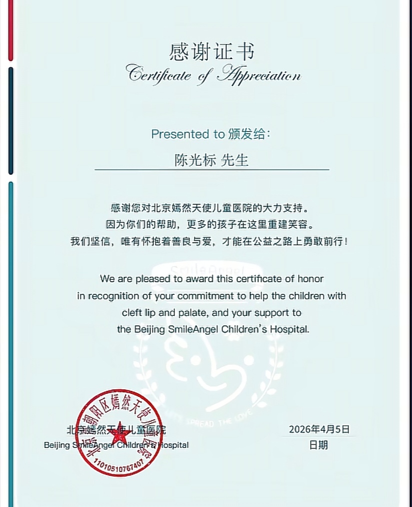 各方回应:对于陈光标捐款一事,嫣然天使儿童医院颁发了感谢证书给陈光标:感谢他对医院大力支持,因为帮助,更多的孩子在这里重建笑容。我们坚信,唯有怀抱着善良与爱,才能在公益之路上勇敢前行!