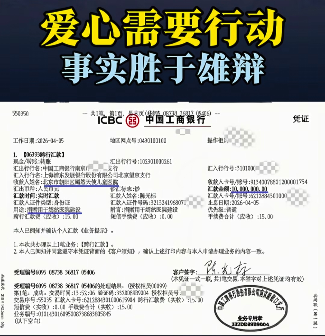 陈光标说捐款也是说到做到,4月5日就通过工商银行进行了汇款,然后把银行的汇款单给发了出来。