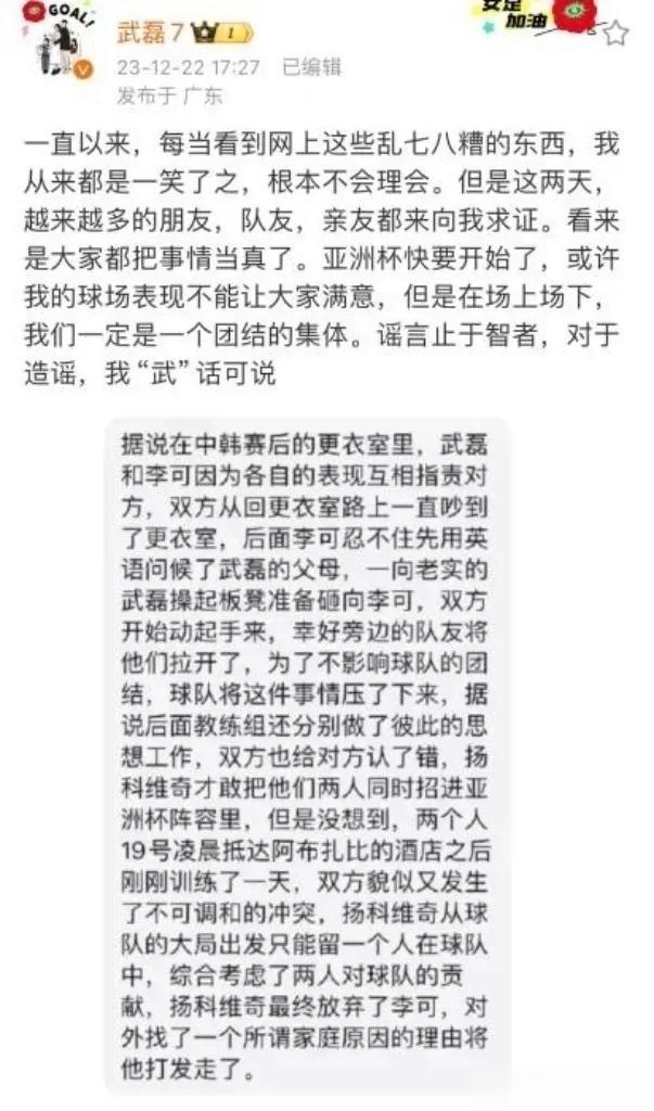武磊发文辟谣与李可内讧传闻,李可离队所谓的的“家庭原因”实则是因训练迟到,被扬科维奇除名,并且武磊等人还为李可求情,但扬科维奇在严肃军纪方面没有选择妥协。