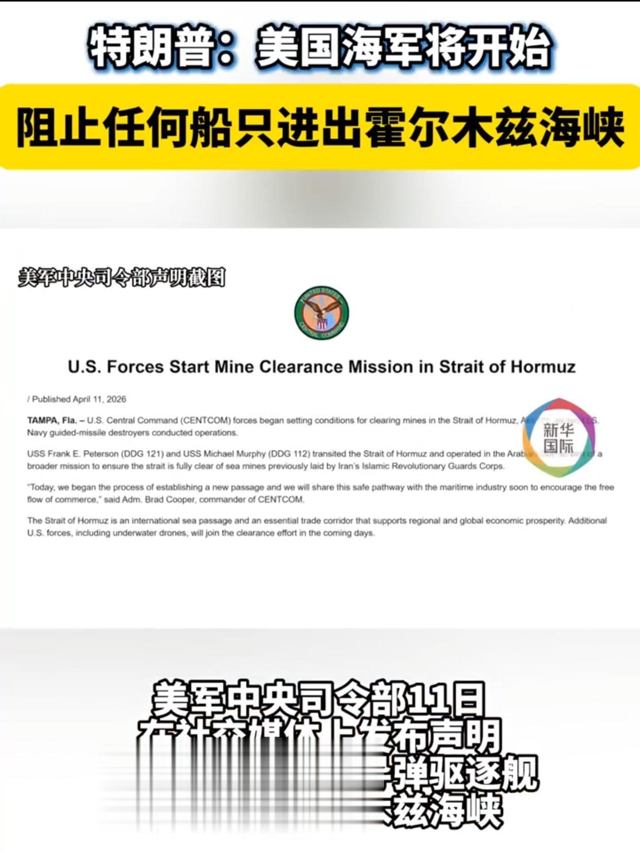 4月12日,特朗普在社交媒体上发出了迄今最具威胁性的表态:美国海军将立即对所有试图进出霍尔木兹海峡的船只实施封锁,同时将拦截在国际水域向伊朗支付通行费的船只,并清除海峡中的水雷。