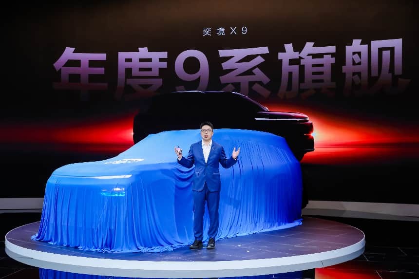 奕境X9定位大型旗舰 SUV,车身尺寸5301mm/2015mm,轴距 3120mm,采用 “经纬流光” 设计语言,配备贯穿灯组与百万像素投影大灯,提供六款定制车色及高端车漆工艺。