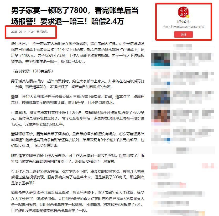 (信息信源:长沙政法 2023.09.14 男子家宴一顿吃了7800,看完账单后当场报警!要求退一赔三!赔偿2.4万 )