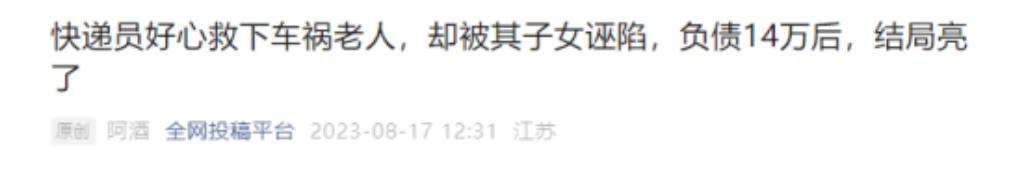 (信息来源:全网投稿平台——快递员好心救下车祸老人,却被其子女诬陷,负债14万后,结局亮了)