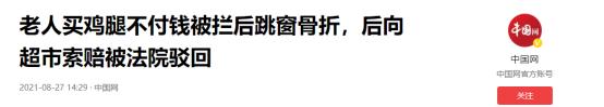 (主要信源:中国网-2021.08.27《老人买鸡腿不付钱被拦后跳窗骨折,后向超市索赔被法院驳回》)