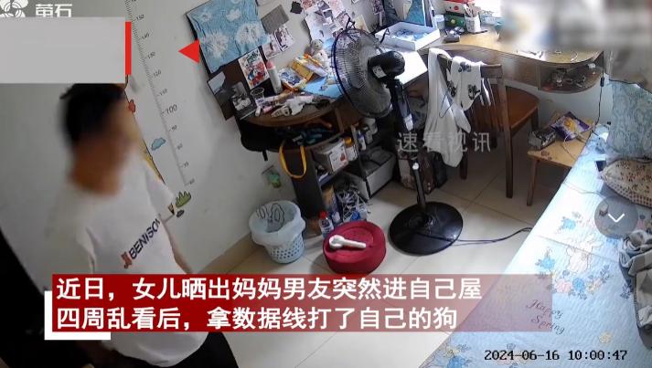 从监控录像可以清楚看到,男子偷偷潜入了女儿的房间,对着躺在床上打盹的小狗就是一阵驱赶。