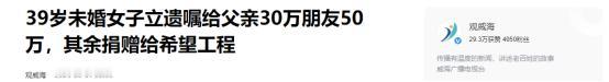 (主要信源:观威海-2024.06.01《39岁未婚女子立遗嘱给父亲30万朋友50万,其余捐赠给希望工程》)