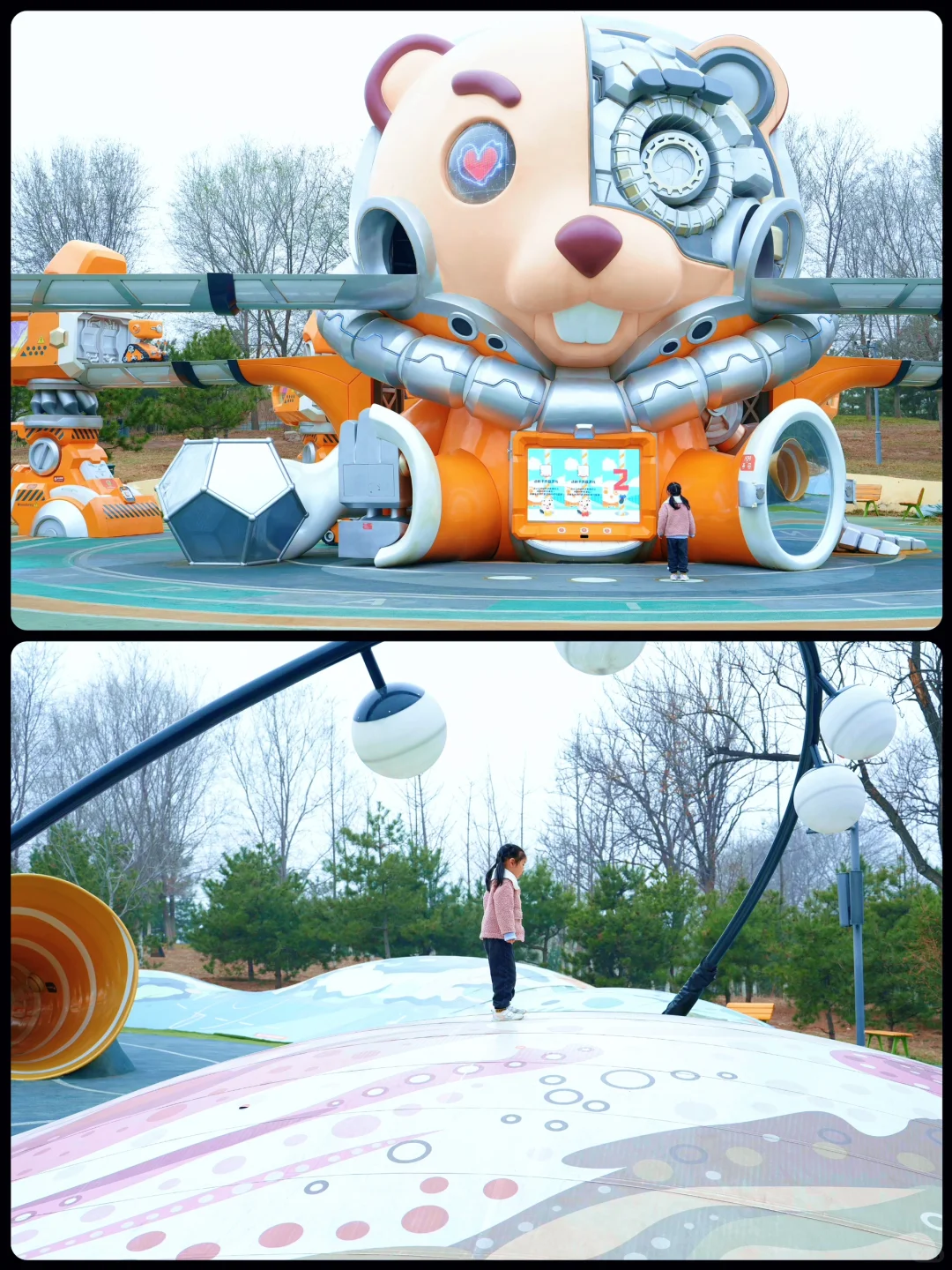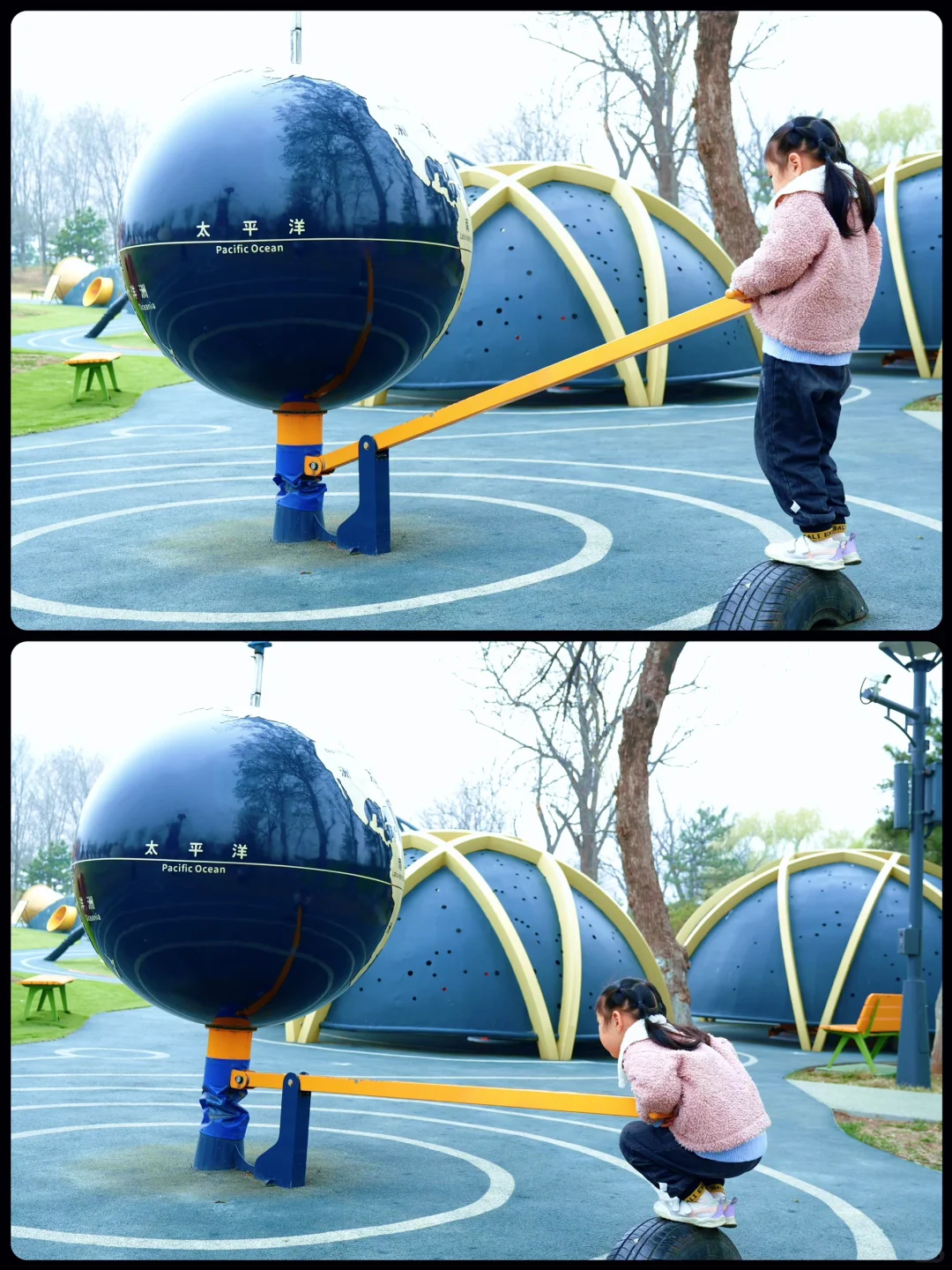 🌟 元气宇宙:有两个很大类似蹦床的坡,小朋友在上面疯跑😃。还有杠杆原理的的跷跷板。两个半圆星球,里面包含了星座、太阳系、虫洞等一些宇宙科普知识