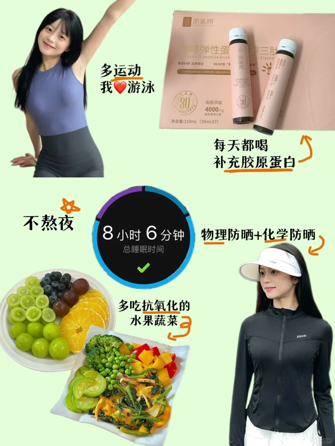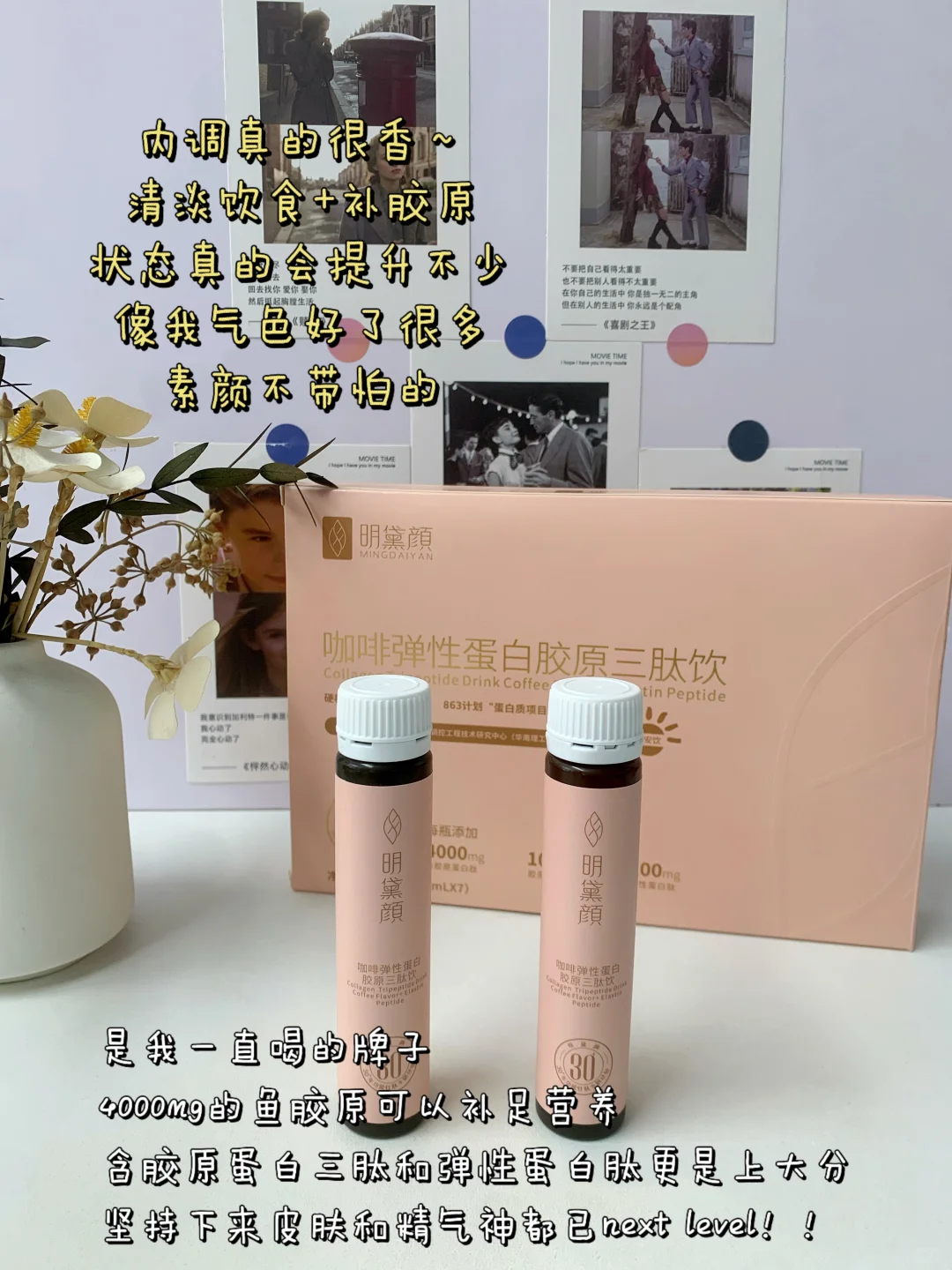 用它辅助保养真的是强强联手!而且也是懒人必备~ 如果你上面的一些生活习惯做不到,还总是被奶茶小蛋糕诱惑...试试它,我是喝的明黛颜,没有经历麻烦又难坚持的食补,每瓶都有4000mg鱼胶原和1000mg胶原蛋白三肽,还添加了弹性蛋白肽,高含量,易吸收,怪不得坚持喝下来,我这气色真的一天比一天红润了