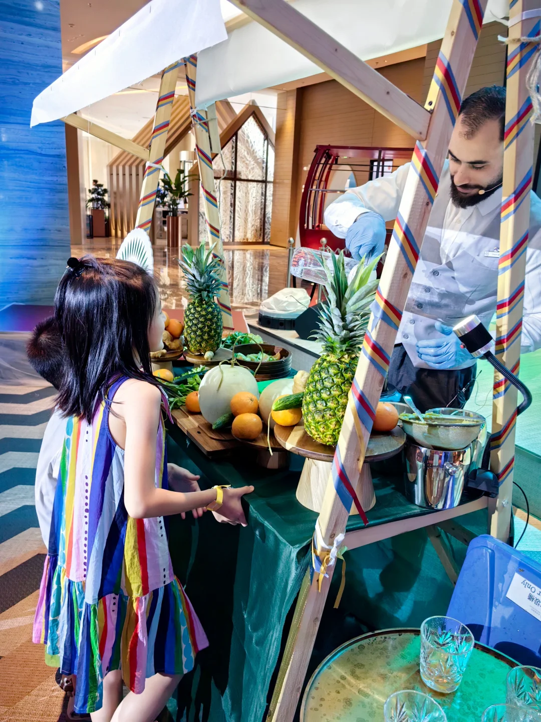 🍹14:00-15:00 吃完午餐,小朋友去白沙滩挖了会儿沙子。还在一楼制作了无酒精鸡尾酒~尝试了好多种搭配,一杯接一杯哈哈~