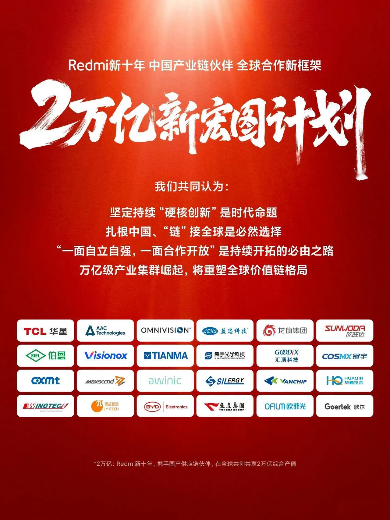 真正的扶持国产[啤酒]红米昨天邀请了一众合作过的国产领军产业链伙伴们开了个闭门沟通会,商定了一个未来十年“2万亿新宏图计划”,计划共创共享2万亿综合产值,带动国产供应链集群崛起[赞]