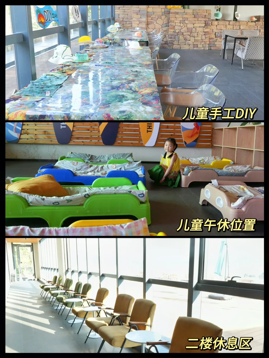 ☀️吃过午饭就可以来东湖啦,坐上景区的观光车直接可以到东湖沙滩景区,中午温度较高,咱们就先带孩子到餐厅二楼参加手绘或沙滩帽涂鸦DIY,面部彩绘等一些孩子比较喜欢的项目,活动大概是14:30开始,餐厅二楼的观景台视野很好,还有空调,小朋友参加活动,家长们点杯咖啡,刷会手机,悠哉游哉的先休息一下