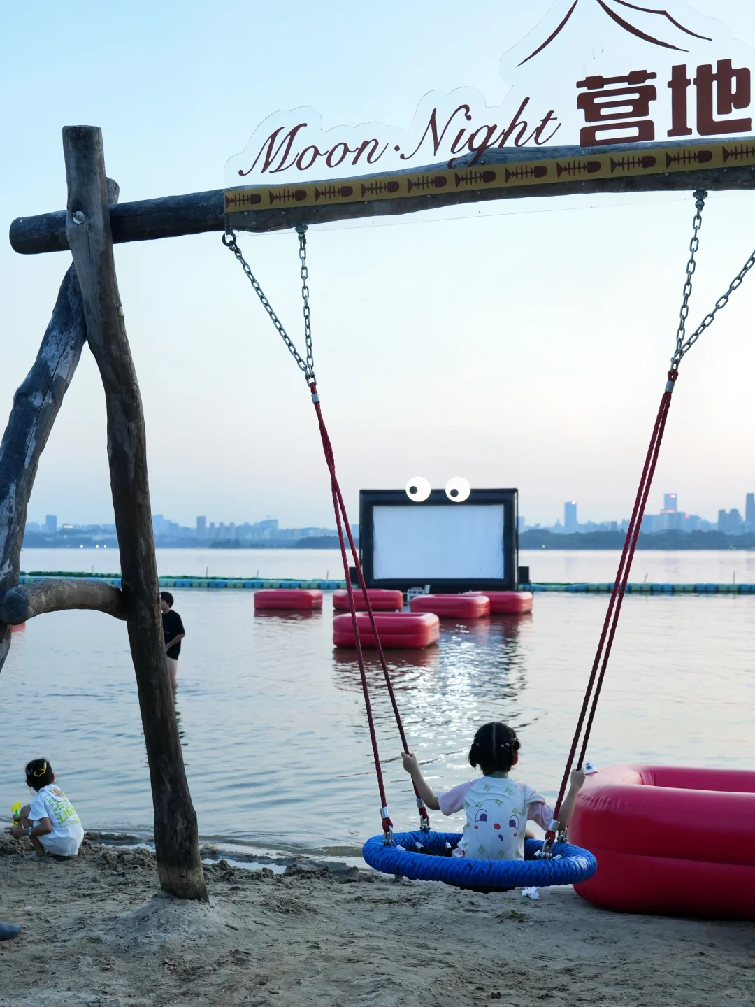 🎬七点半,漂浮影院也开始了,小朋友坐在沙滩秋千上,三两家人或好友一起看奥运,是不是也很惬意