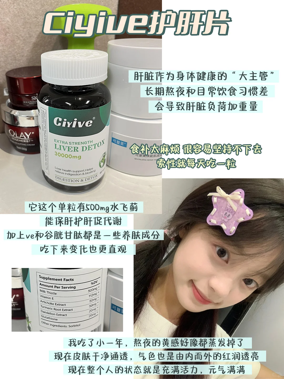 ③除了干净饮食不吃外卖甜品外,还有在进行养生内调减轻肝脏负荷。要知道肝是全身代谢的场所,老祖宗说“肝藏血,主代谢”,像熬夜脸色灰白萎黄,爱出油长痘就是代谢出了问题。每天会随餐搭配吃一颗护肝片,在吃的是Ciyive护肝片,它家含量拉满,单粒有500mg的水飞蓟宾,还搭的谷胱甘肽、姜黄、ve也都是养肤大佬,随餐吃真的很方便,现在不光皮肤干净健康透亮,嘴唇也都是粉嘟嘟的,素颜气色都好到根本不用化妆。