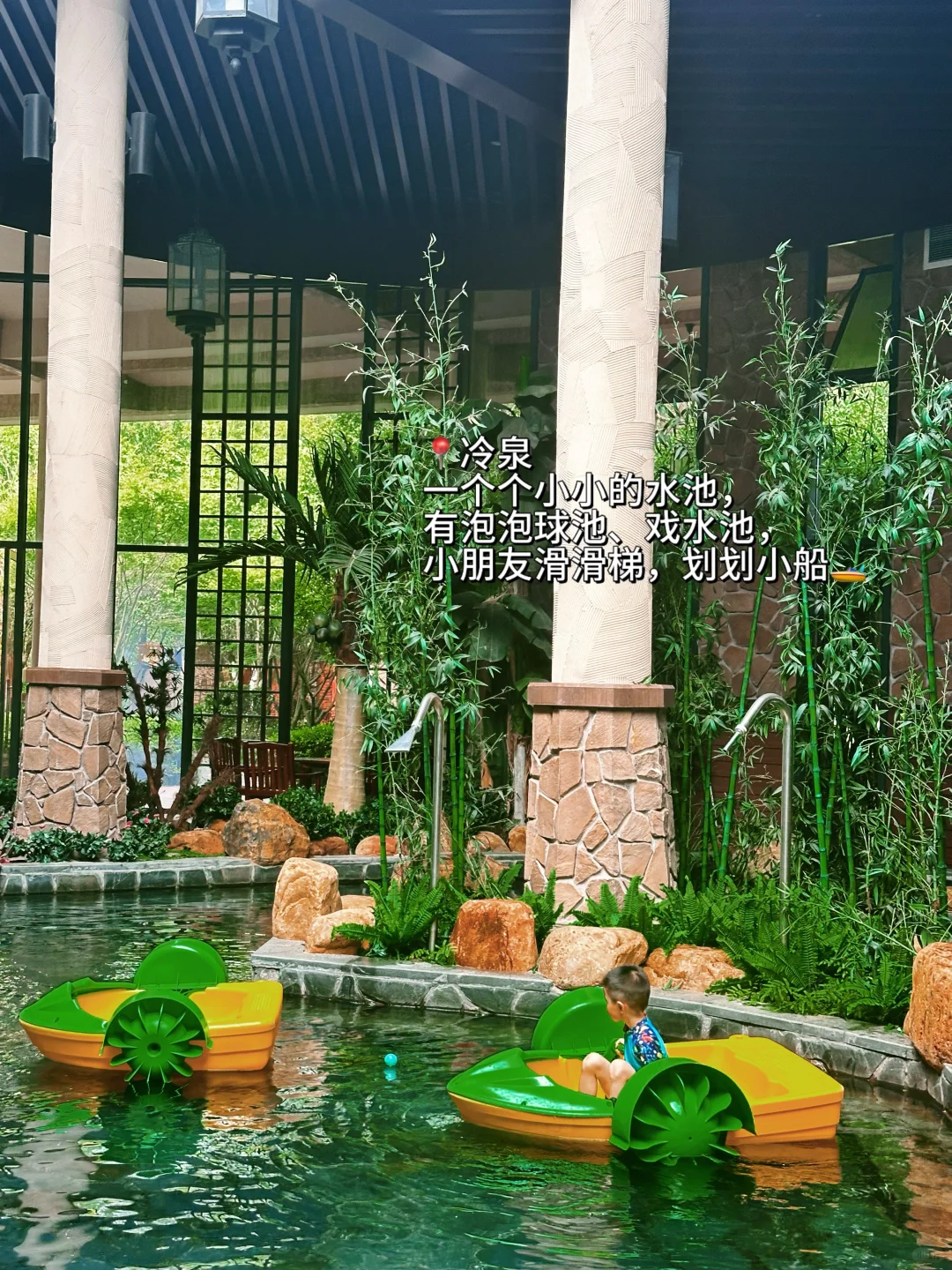 上午,酒店里有个冷泉池,冬天泡温泉,夏天玩水的。早上我们去的时候直接就包场了,有泡泡球池、手摇船,小朋友打打水仗。