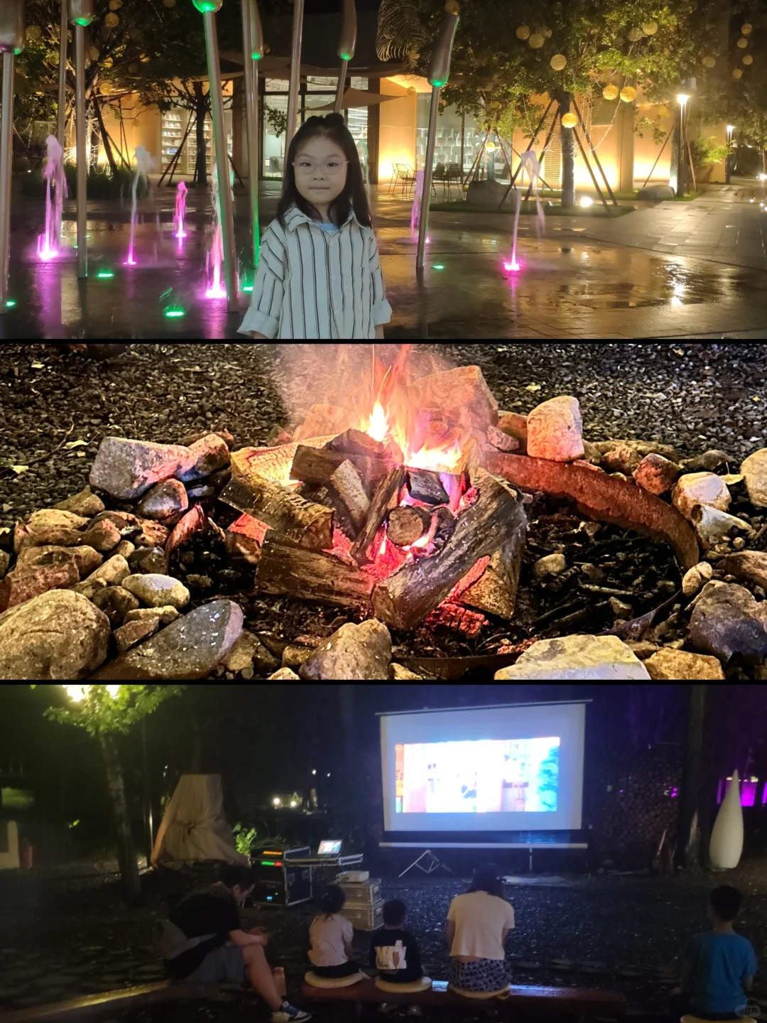 营地区有一个儿童的微型无动力乐园,小朋友晚上吃过晚餐可以和好朋友一起玩一会放放电,夜晚[露营灯R]的时候,有户外电影和篝火晚会,和家人好友一起,喝喝啤酒🍺,吃吃烤串,太惬意了