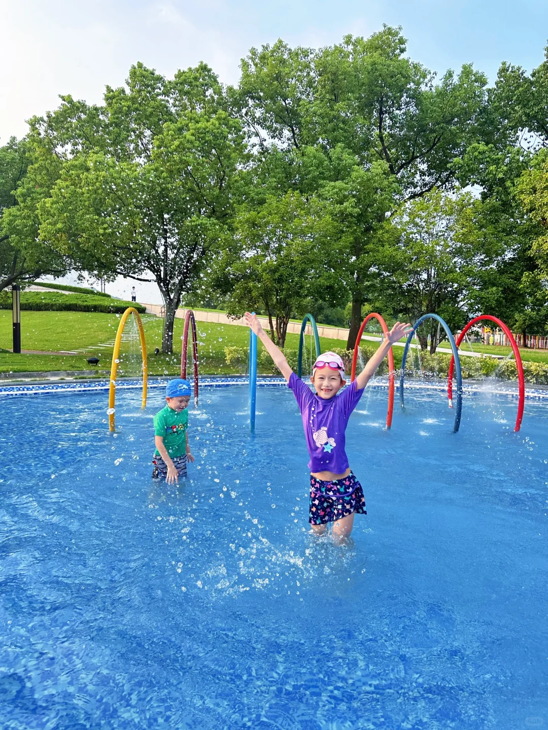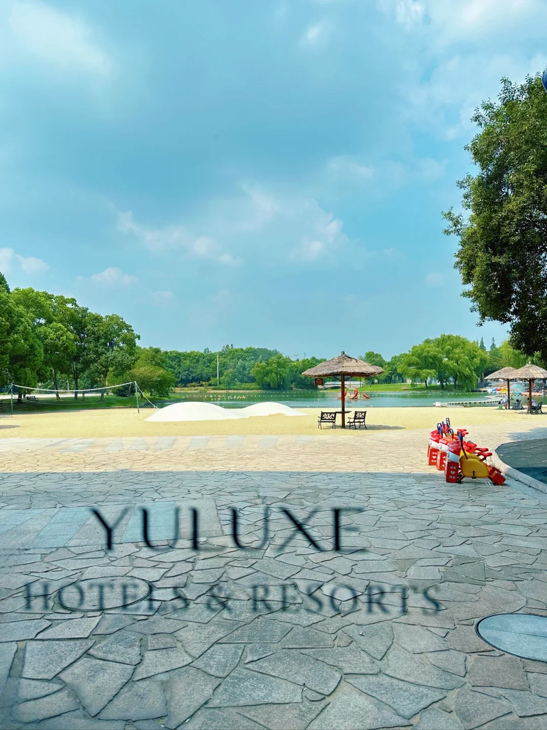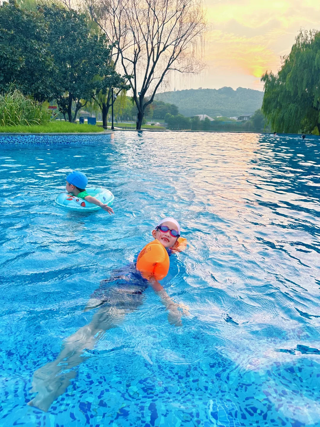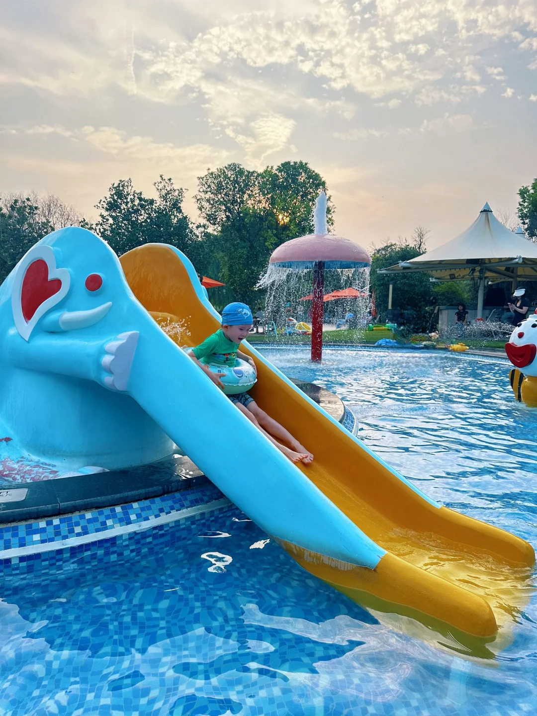 室外有几个儿童泳池,水深0.6米,小朋友在水上滑滑梯就能玩半天。大泳池傍晚的时候看夕阳西下的佘山,美得很。