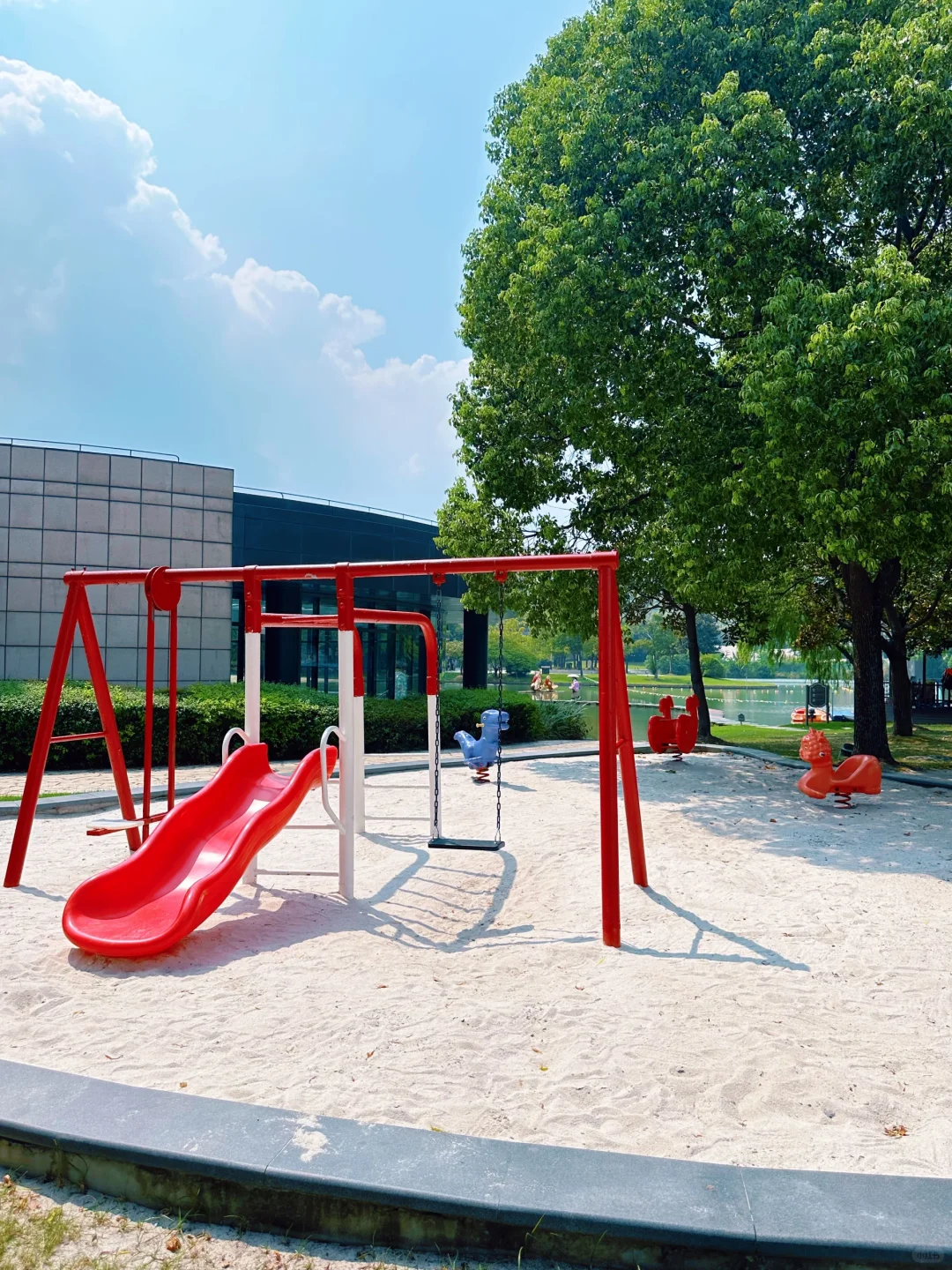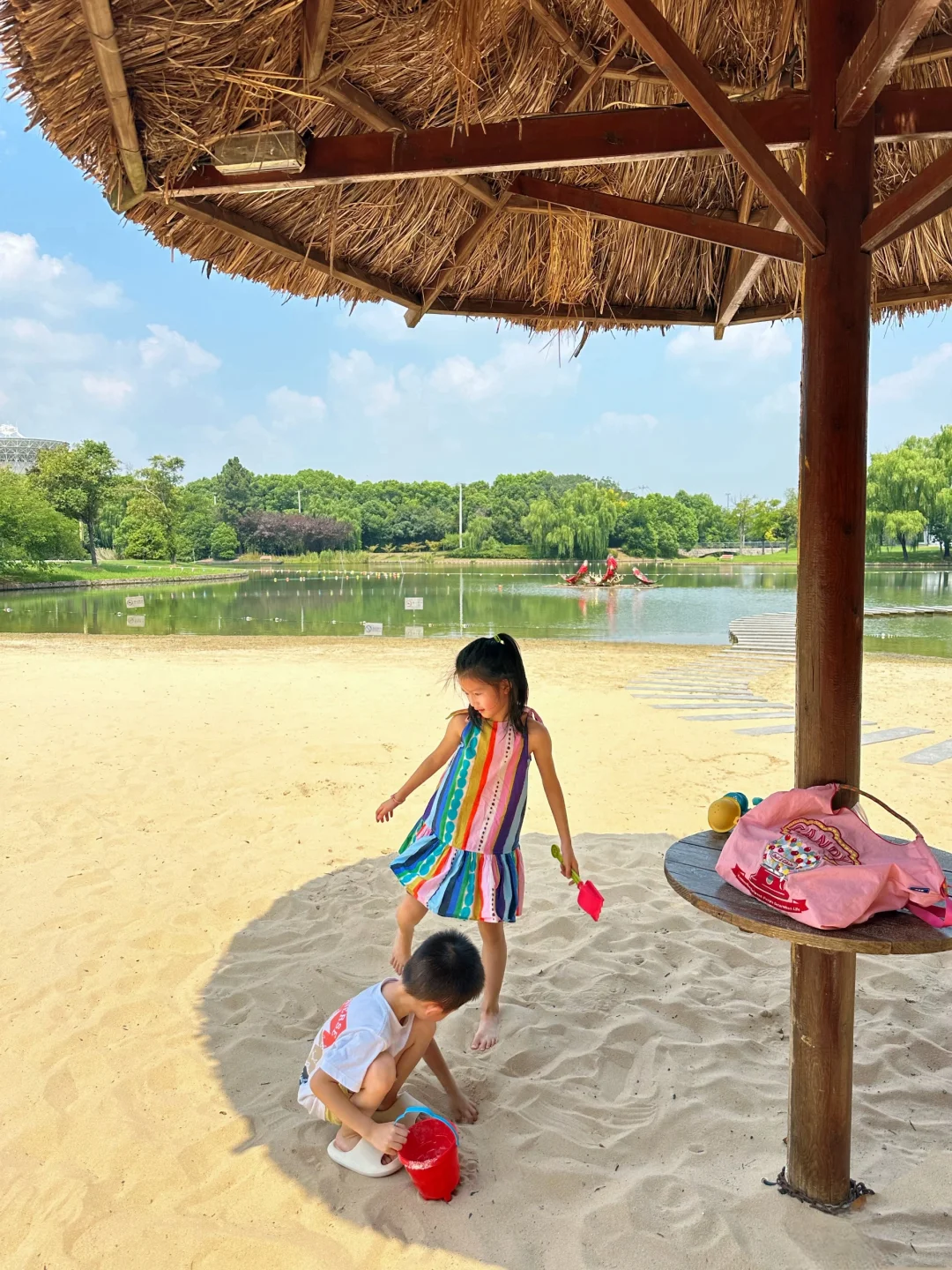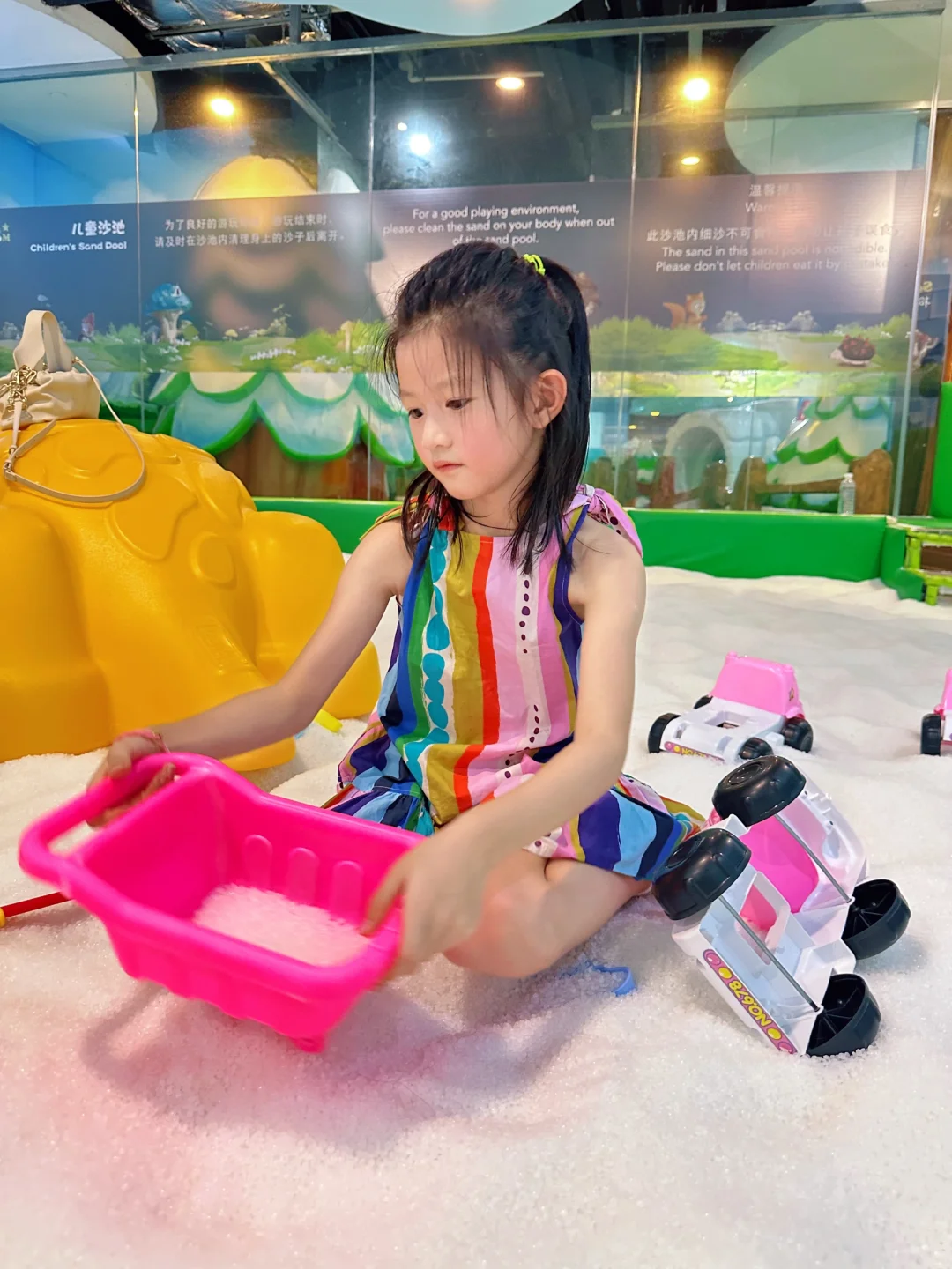 一定要选清晨或者傍晚去玩,不晒,沙子细。带一套挖沙工具小孩能挖老半天,还有个跳跳云,小朋友蹦得欢。