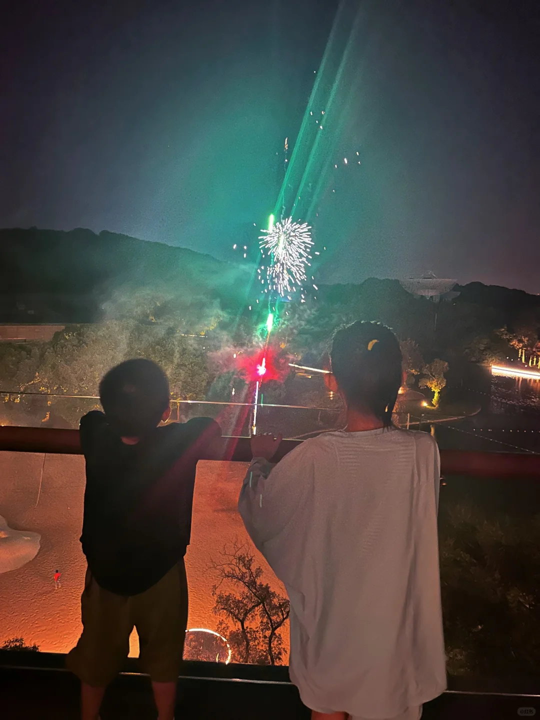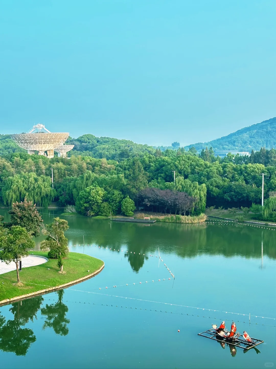 湖景双床房55个平方,房间面积阔绰,还带了个衣帽间。阳台景观非常好,望出去有佘山有湖还有天马射电天文望远镜。晚上还看了一场人家放的沙滩烟花。