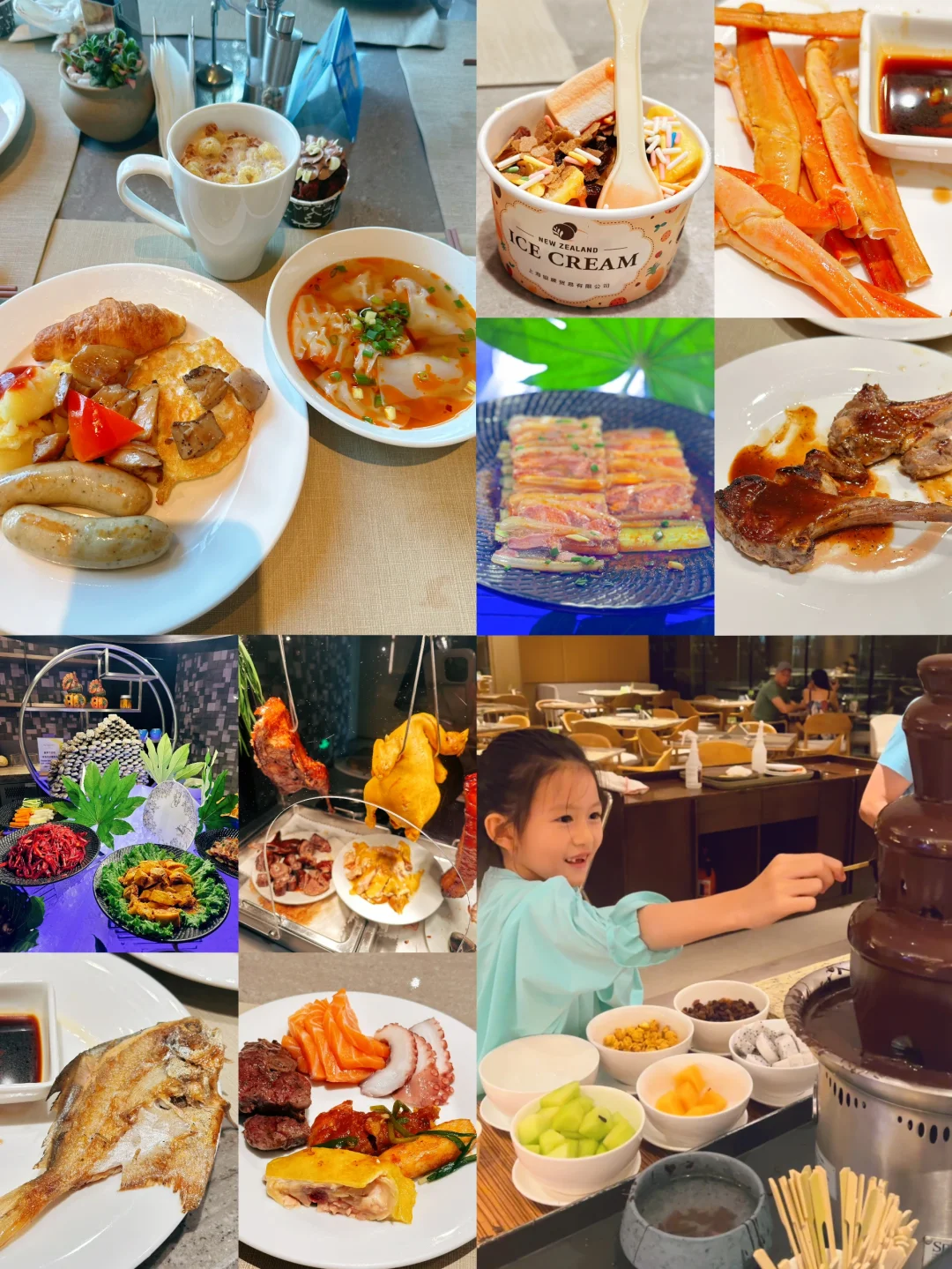周末晚上的海鲜自助灵的,有虾、三文鱼、各种蟹、蟹脚、贝壳。铁板的牛排、羊排,烧腊的白斩鸡品质也在线。