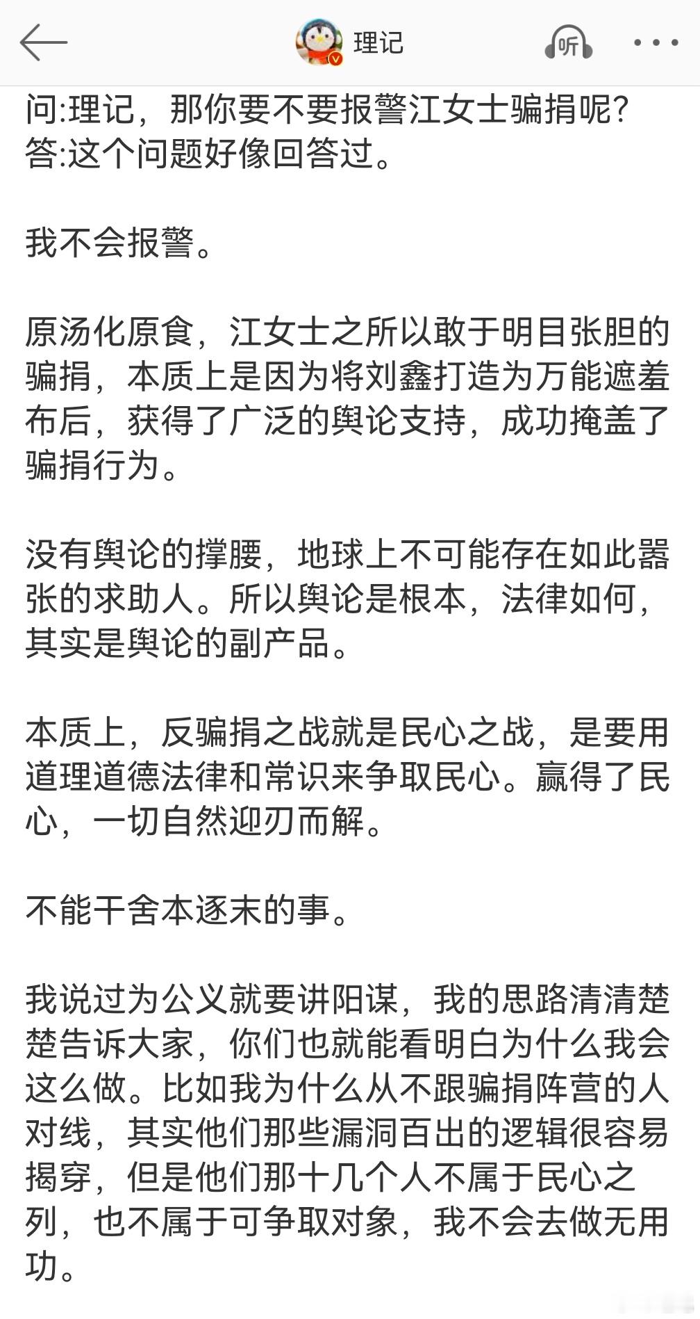 答:我看了江女士的原文,江女士只说诈骗,没有提到骗捐。我想是因为江女士对骗捐这个话题极度敏感吧。