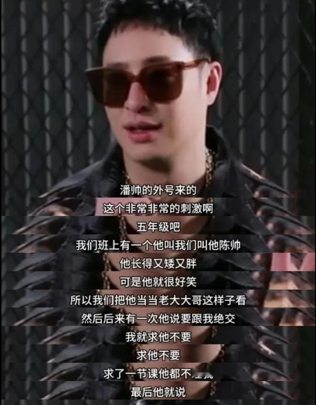 有点炸裂了!在采访中,潘玮柏说出了他被叫“潘帅”的由来,称:在五年级的时候,班里有个又矮又胖很搞笑的男生,叫陈帅,同时也把他当老大。有一次闹矛盾了,陈帅要跟潘玮柏绝交,潘玮柏就一直求他不要,求了一节课。