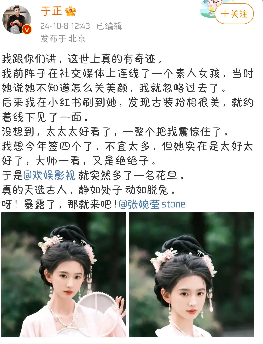 10月8日,于正发文官宣新签约的女艺人张石头,还用了“太太太好看了,一整个把我震惊住了”,“真的天选古人,静如处子 动如脱兔”等词来形容,可见于正对她非常的喜欢和满意。
