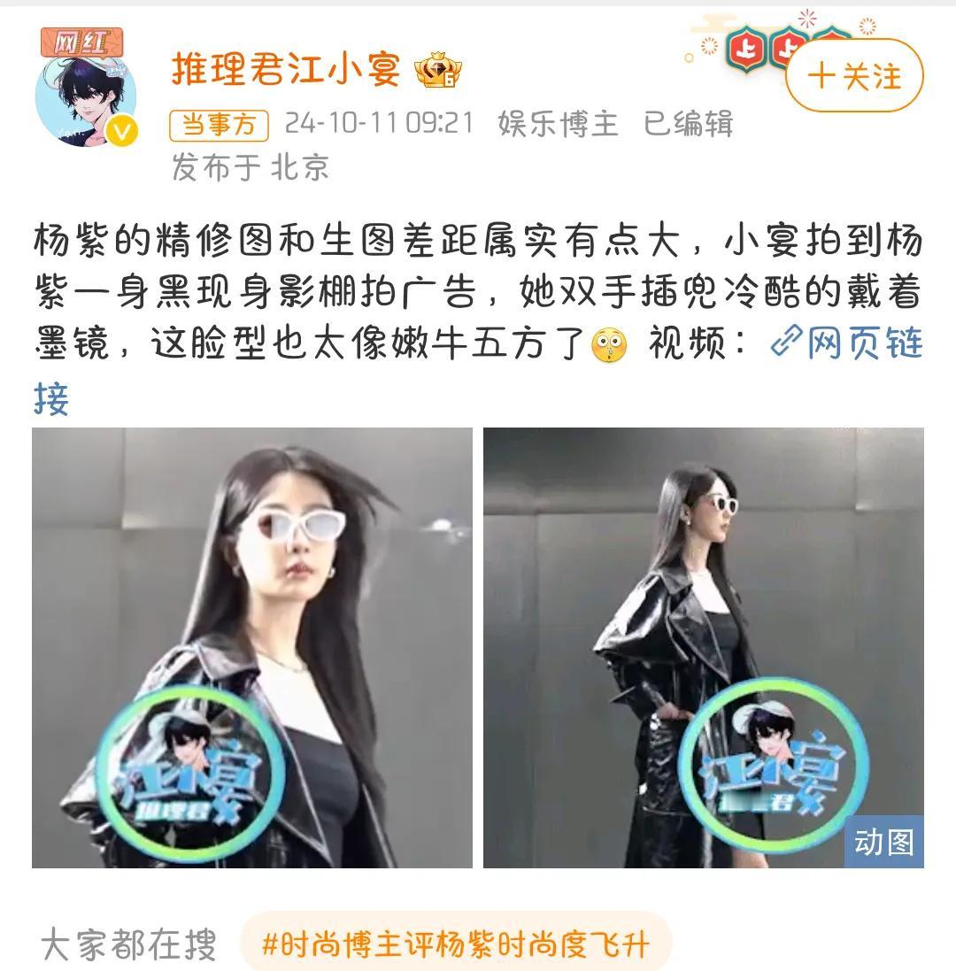 10月11日,狗仔江小宴发文称杨紫的精修图和生图差距属实有点大,还称:他拍到了杨紫一身黑现身影棚拍广告,她双手插兜冷酷的戴着墨镜,这脸型也太像嫩牛五方了。