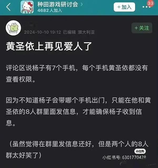 评论区有网友透露称杨子有8个手机,每个手机黄圣依都没有查看权限,且因为不知道杨子会带哪个手机出门,黄圣依就只能在她和杨子的8人群里面发消息,才能确保杨子能收到信息。