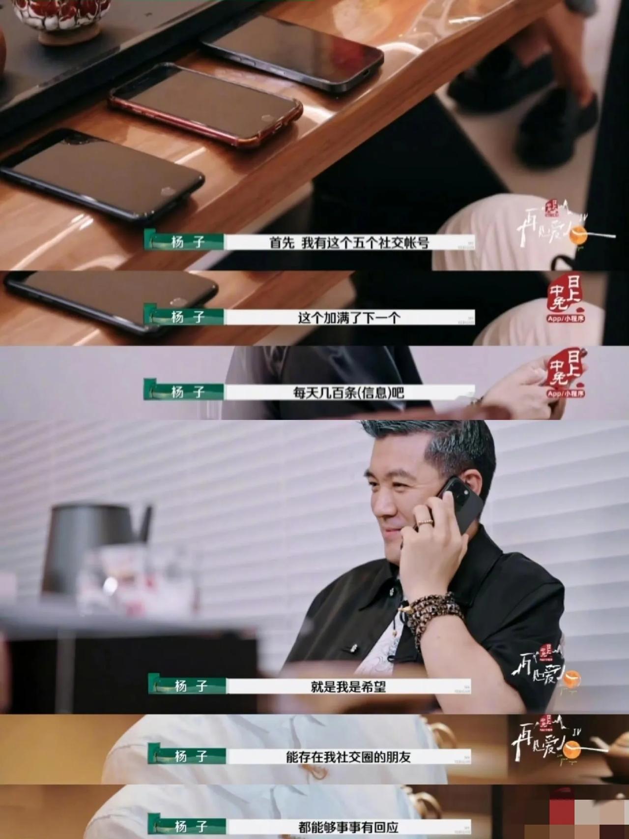 此外杨子在节目中还这样说到,自己每天有几百条消息,很多事情需要即时处理,他希望能存在他社交圈的朋友,都能够事事有回应,就是朋友的一天不能在他这里产生怨气。