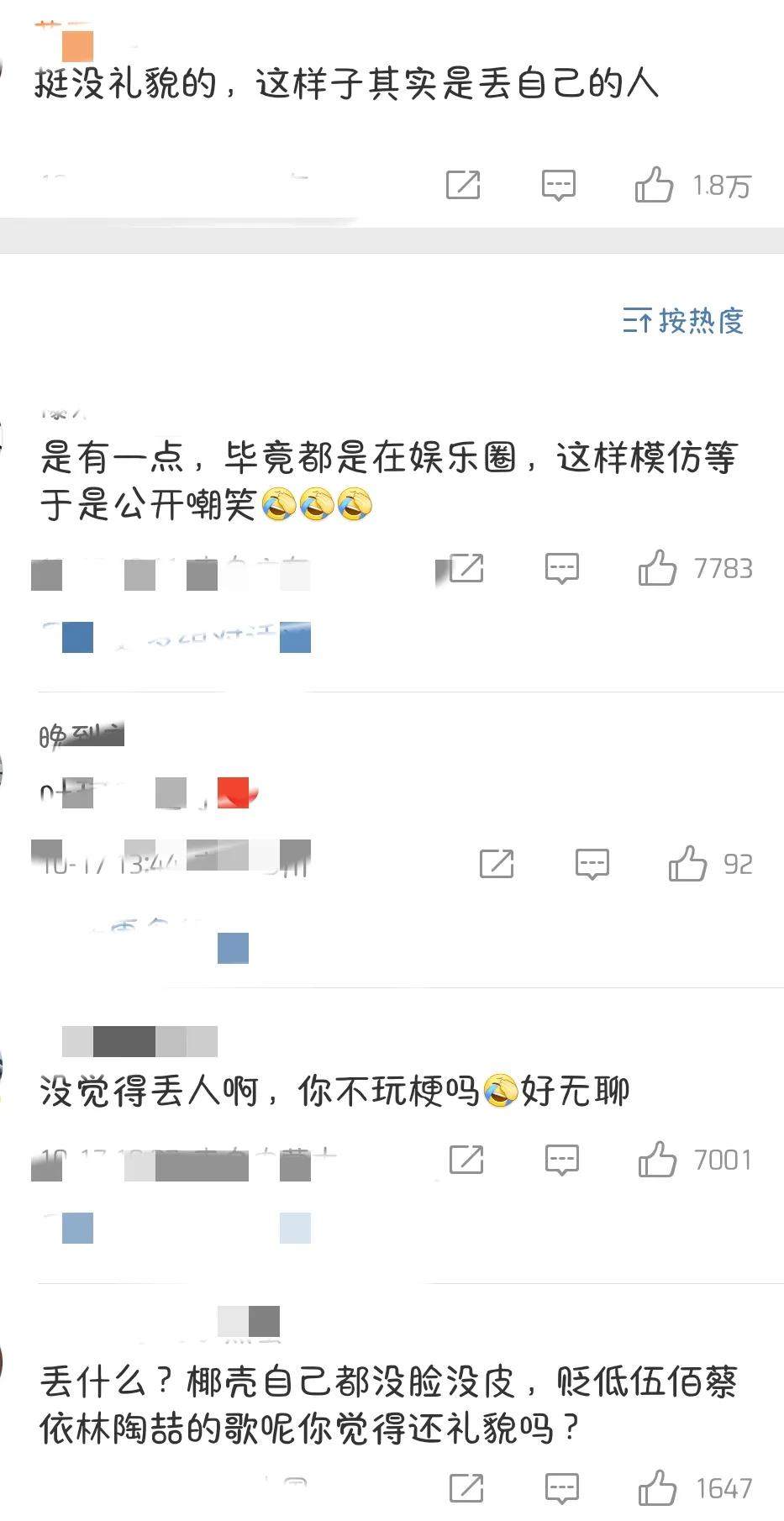 丢什么?椰壳自己都没脸没皮,贬低伍佰蔡依林陶喆的歌呢你觉得还礼貌吗?