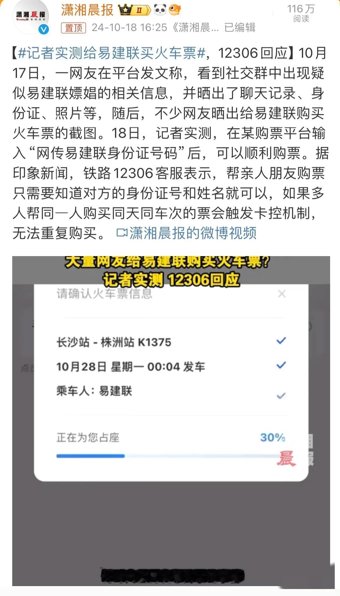 10月18日,昨日知名运动员易建联被曝出疑似嫖娼,甚至身份证等信息也被泄露了出来,对此本人并未出面回应。于是有网友为了验证下身份证的真实性,居然在12306上给他买火车票!