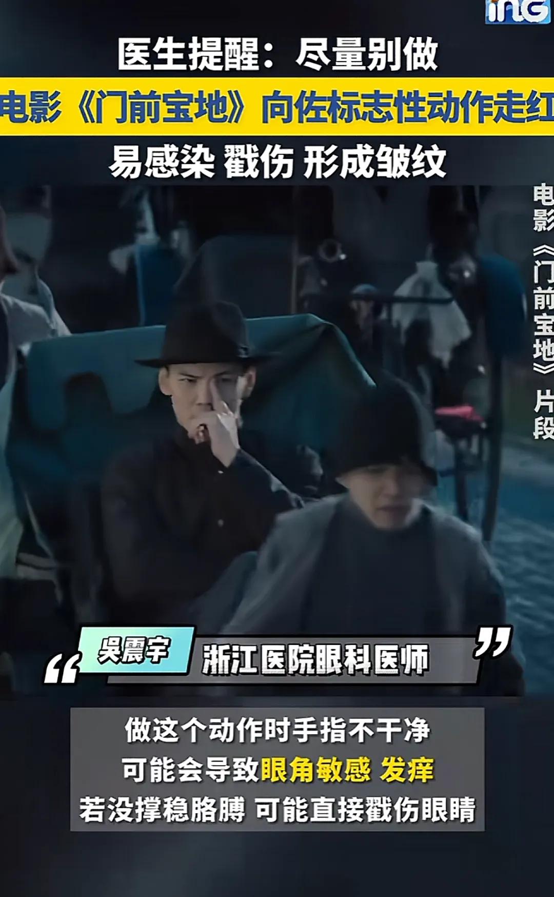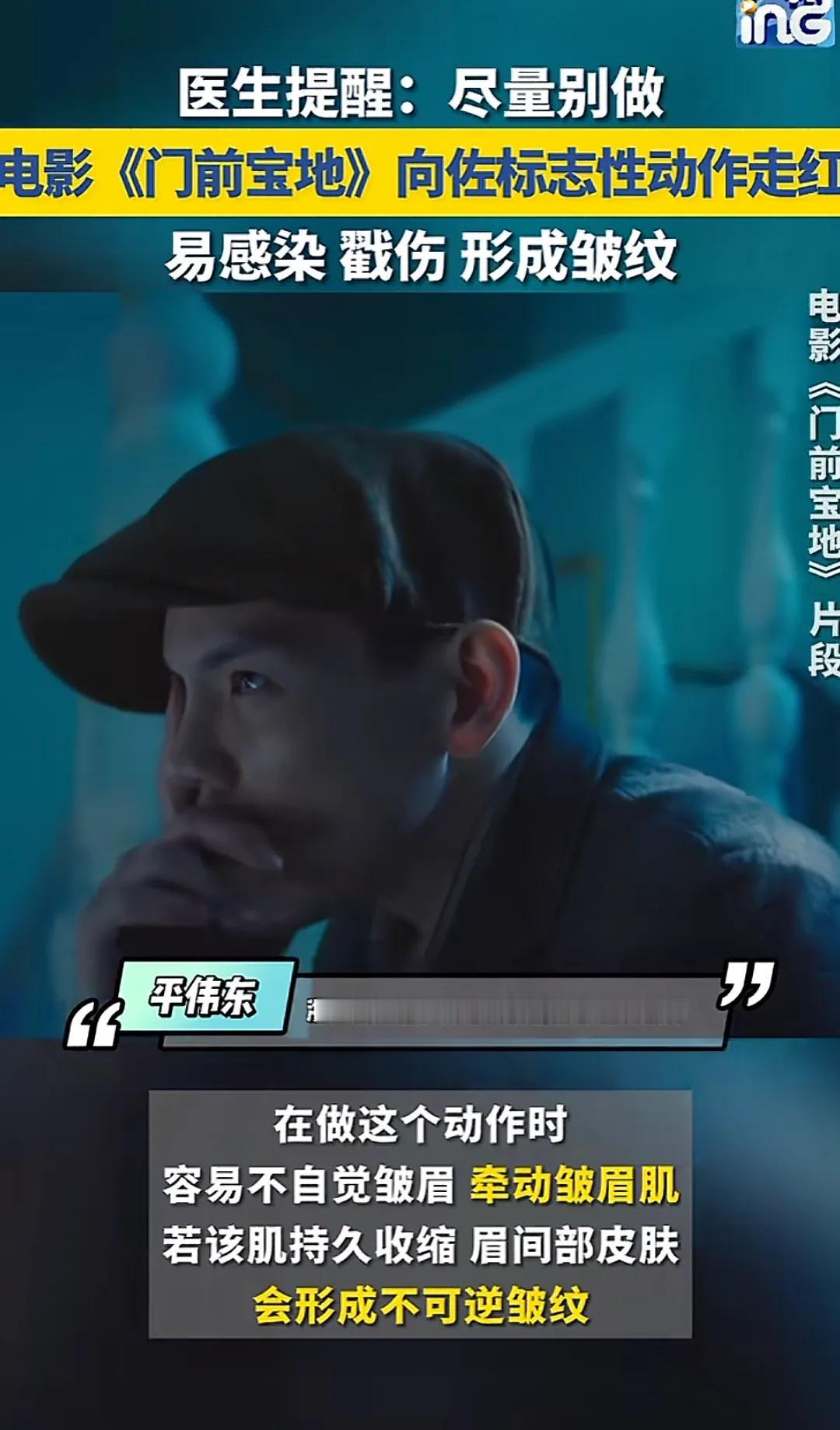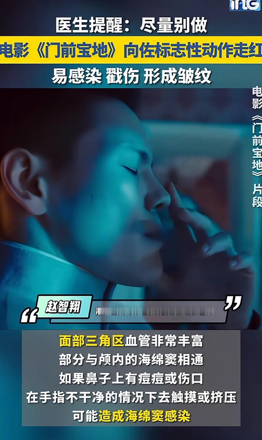 近日,向佐和郭碧婷主演的电影《门前宝地》上映,电影里面向佐举着手指紧贴鼻梁表情深沉的样子被很多网友模仿,对此有医生称:尽量别做。