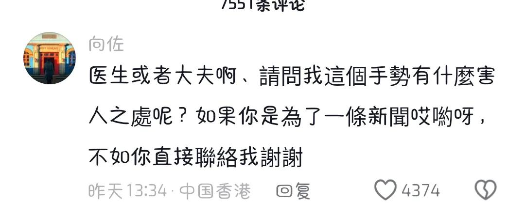 医生提醒说到这个摸鼻梁手势涉及危险三角区,频繁比划可能带来健康风险! 向佐在评论区回应: “我这个手势有什么害人之处呢?” 隔着屏幕都能感觉到向佐的委屈。