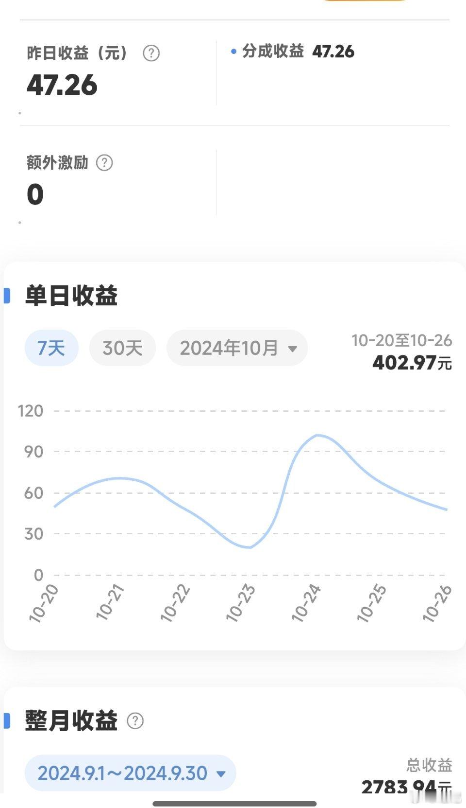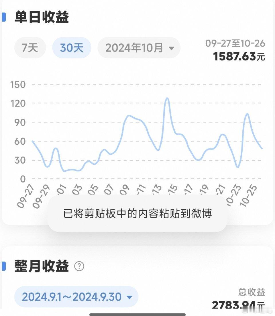 老规矩,这期间公布一下,最近30天微博阅读量2.8亿,最近30天广告共享计划分成1587元,最近七天403元,昨日47元。